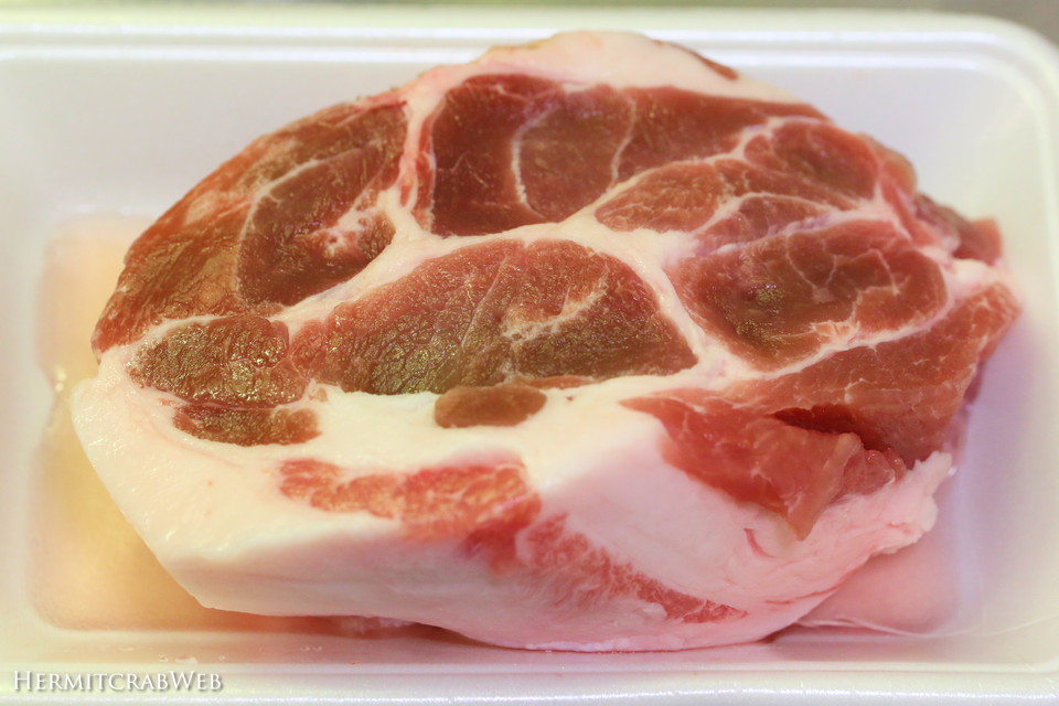 こちら、豚肉のかたまりです。塩と砂糖をすりこんで2日ほど冷蔵庫で熟成させたものです。