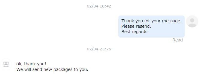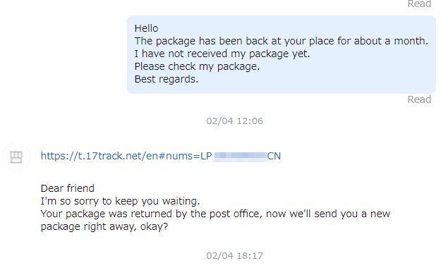 その結果、返送されていることが確認でき、セラーから再送の提案がありました。