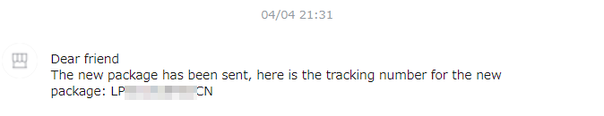 その2日後、セラーからメッセージが有りました。発送できたので追跡番号を送るよ、と。