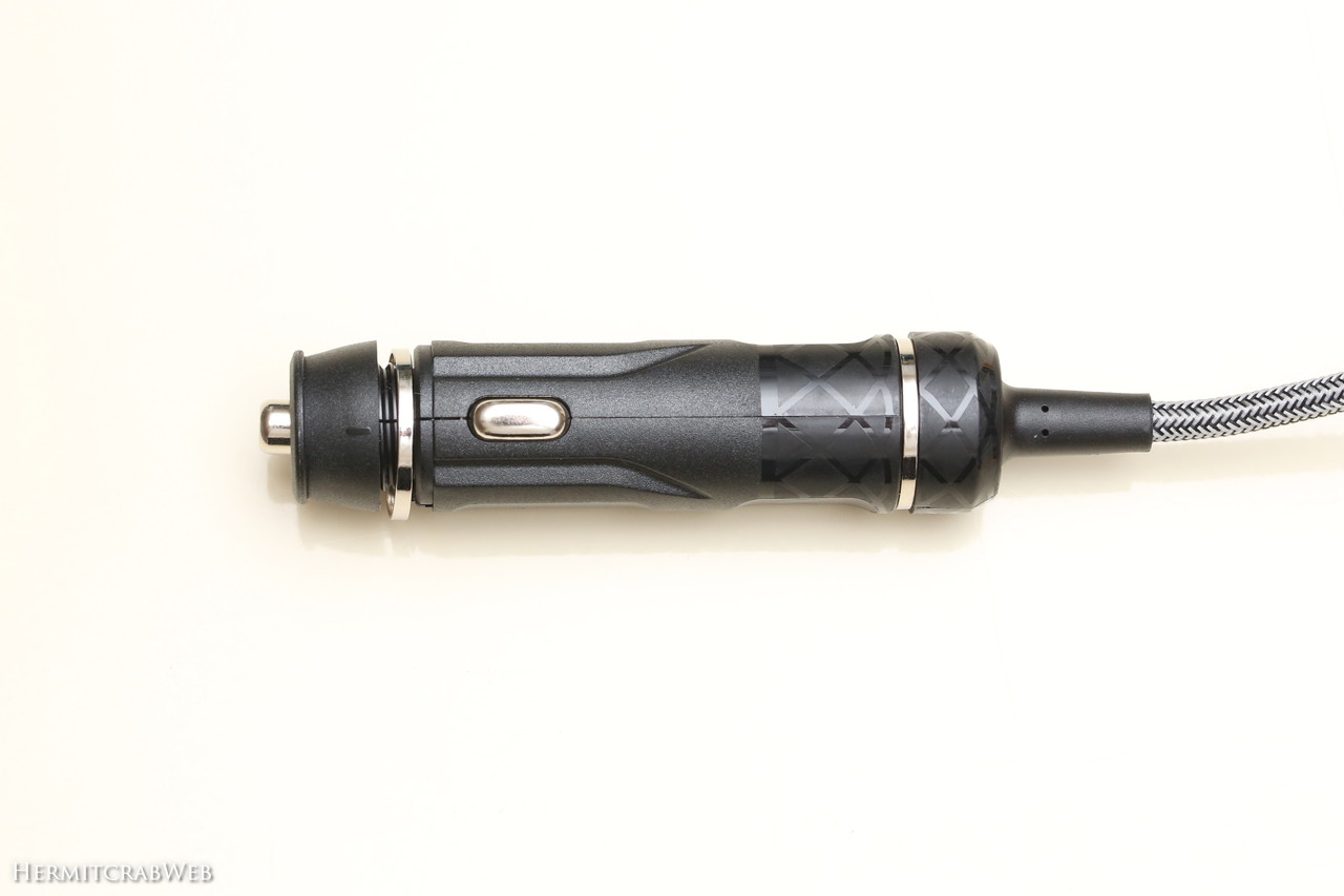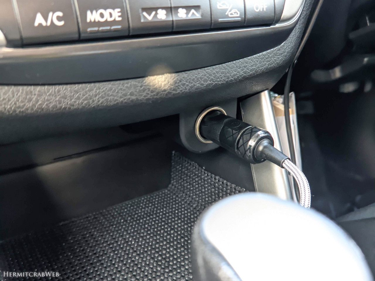 Amazon商品ページのレビューにあるとおり、シガープラグの差し込みは割と硬いです。プラグのサイドにあるピンのバネが硬いのかな?ピンを少し押し込みつつ挿入するとしっかりと固定することができました。