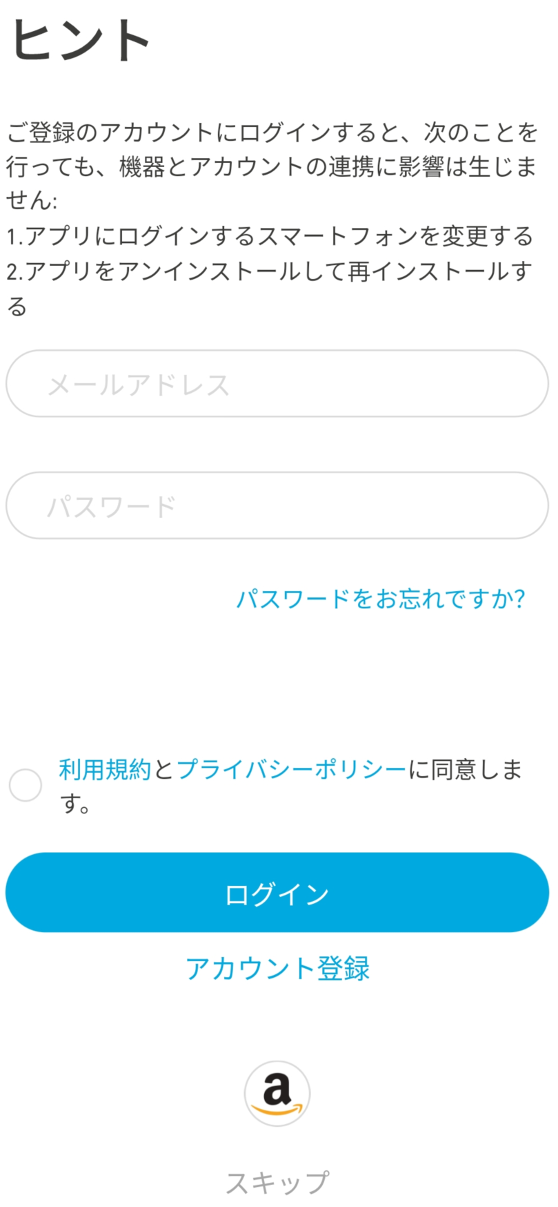 アカウントの登録が必須なように感じますが、実は一番下にあるスキップをタップすると登録をスルーできます。
