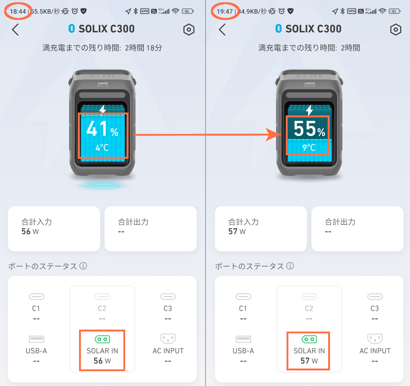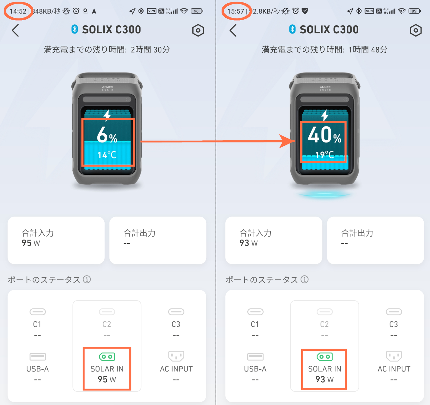 およそ1時間の充電で、C300は残量6%から40%まで充電できました。シガーチャージャーからの入力(ソーラーパネル入力と共用なのでアプリではSOLAR INとなっています)はおおむね100W近くを維持しています。まあ予想通りの結果です。