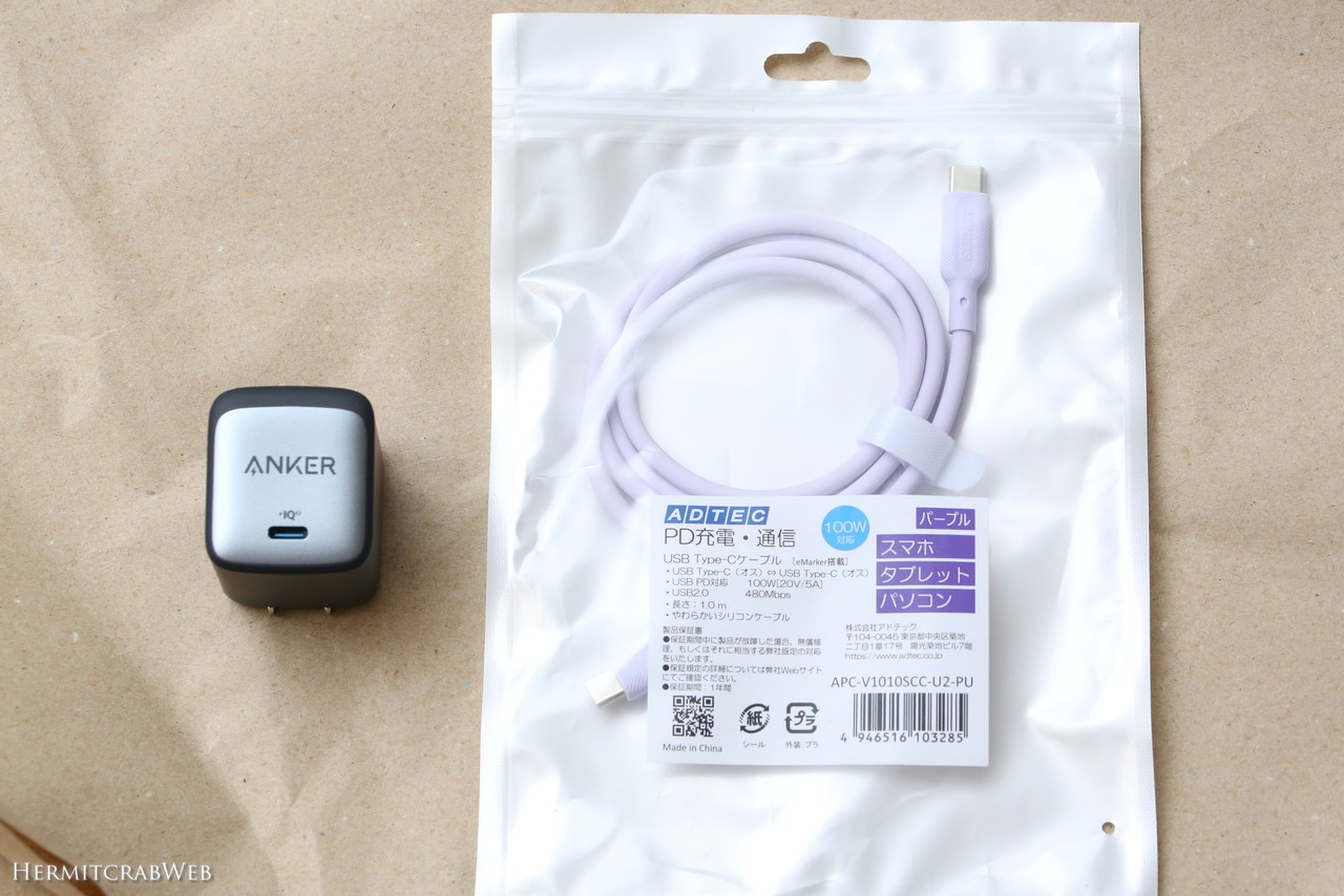 Anker製ケーブルもありますが、小生はAdtecの100Wシリコンケーブルを愛用しています。今回のAnker Nano II 65W購入に合わせ追加購入しました。