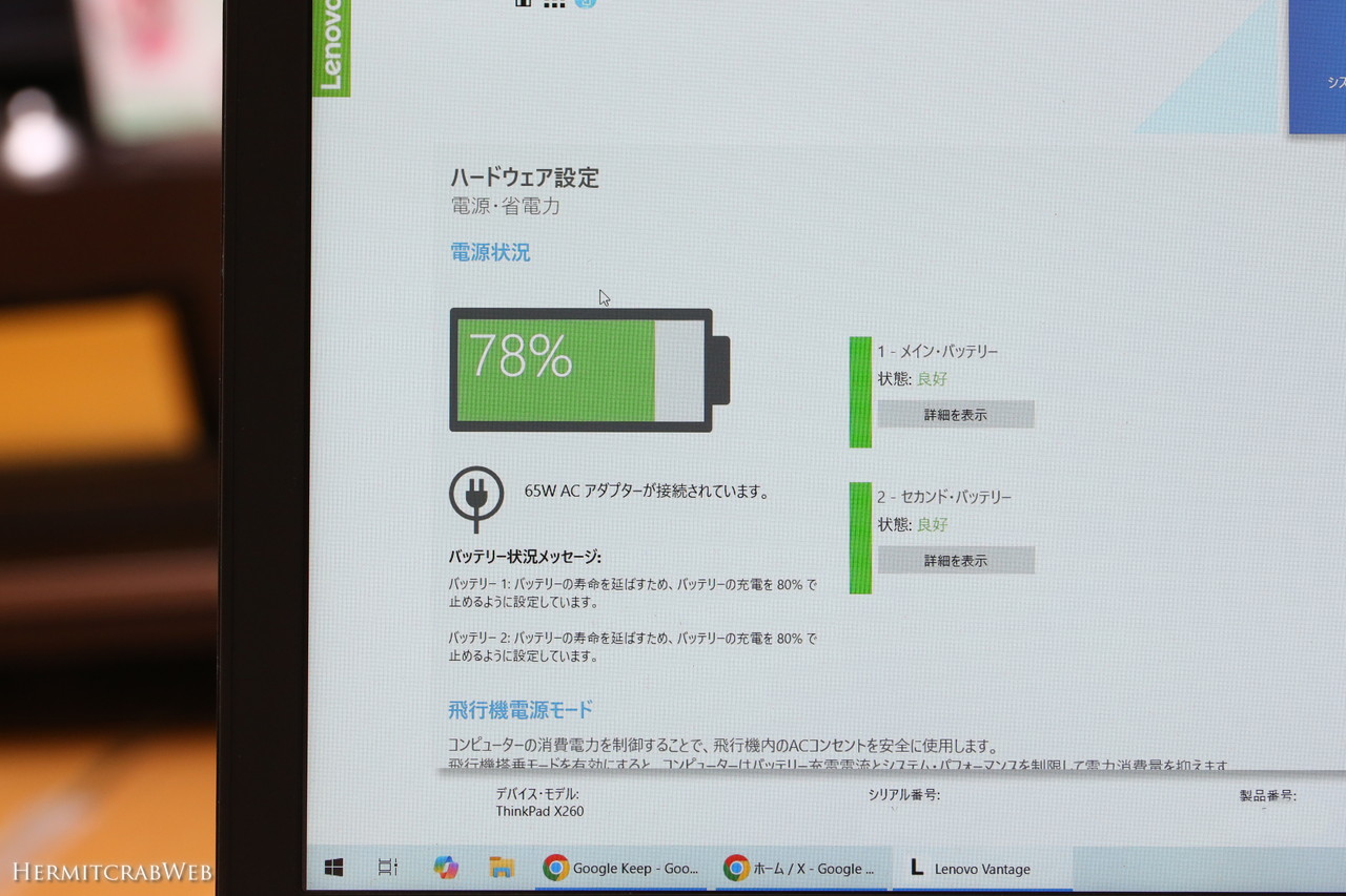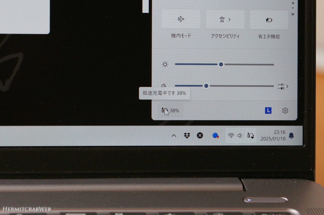 IdeaPadの画面には低速充電中との情報が出ました。