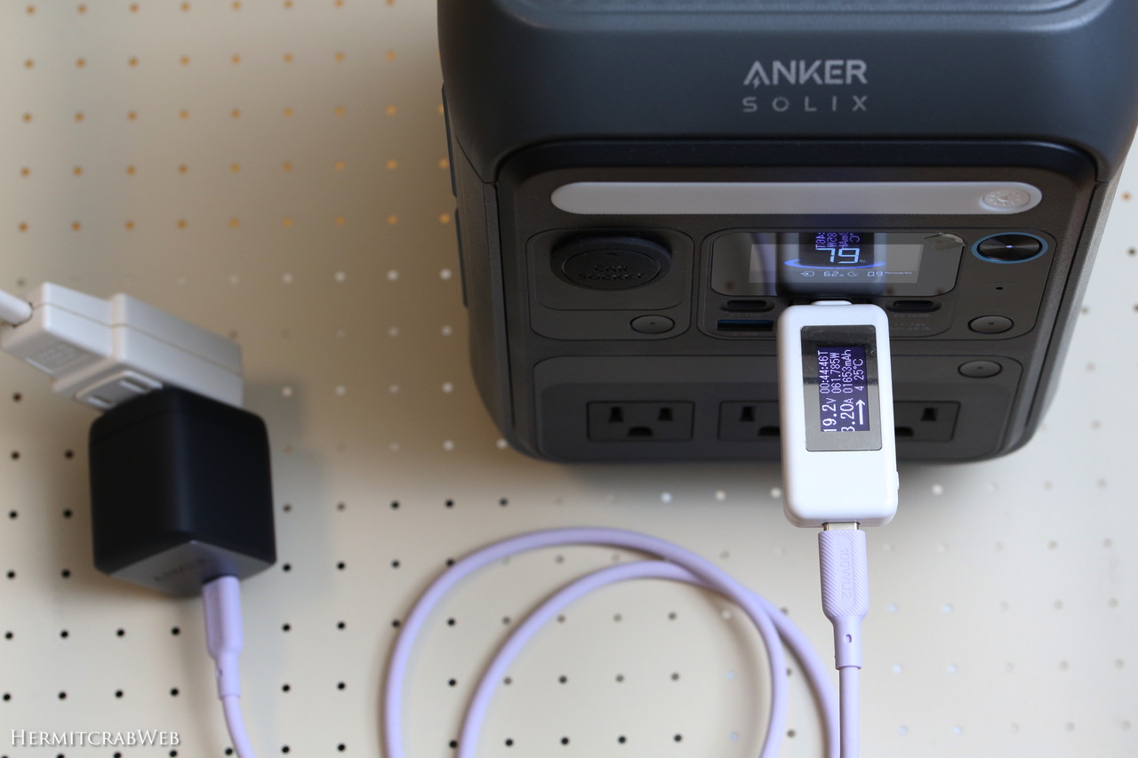 Anker Solix C300への給電はこんな感じ。ほぼフルスペックの62Wで充電できています。見づらいですがSolix本体にも62Wとの表示が出てますね。