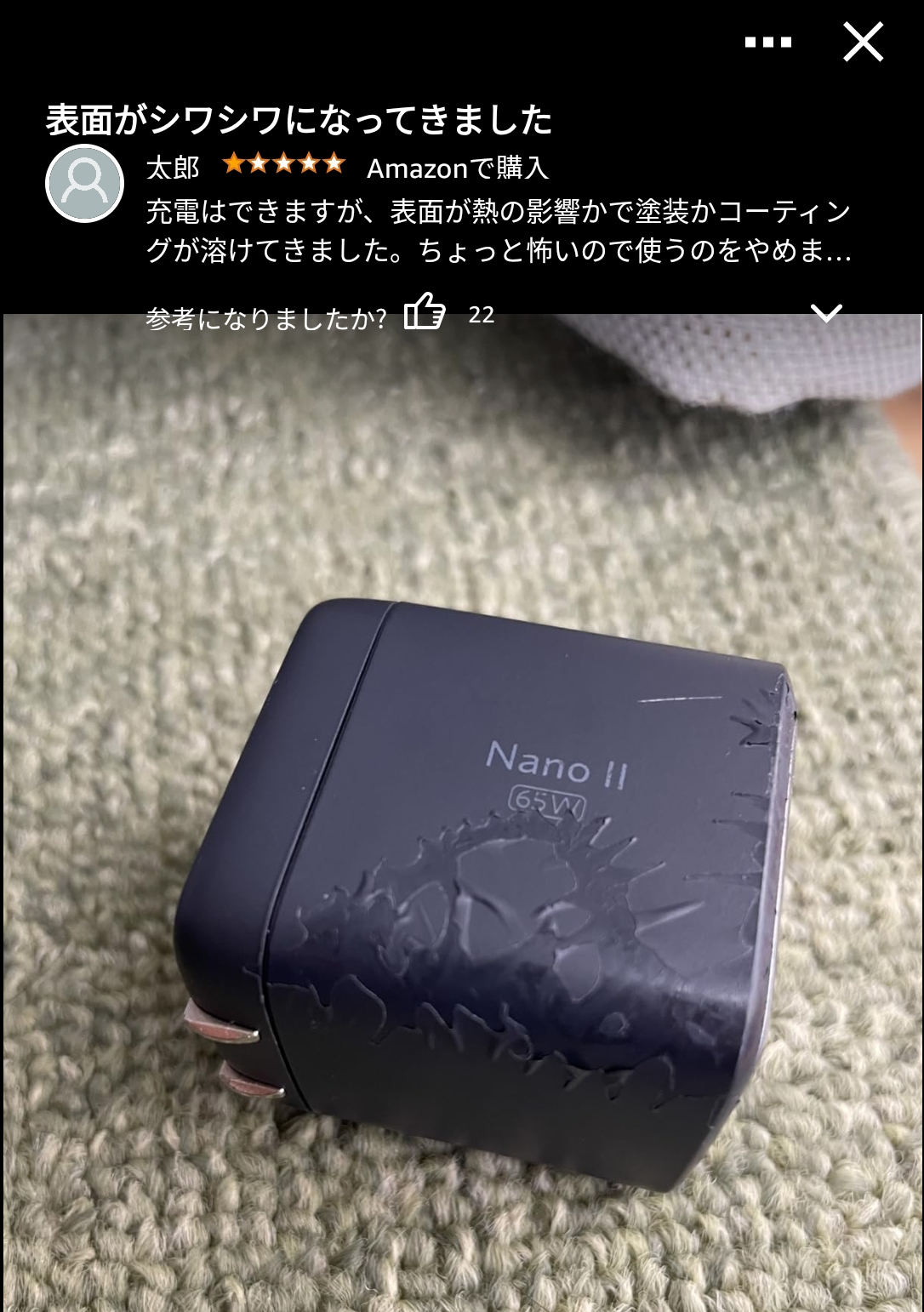 Amazonでこんなレビューを見かけました。表面の塗装膜が膨張し、剥がれています。過熱によるトラブルを心配してこのユーザーは使用をやめていますが・・・