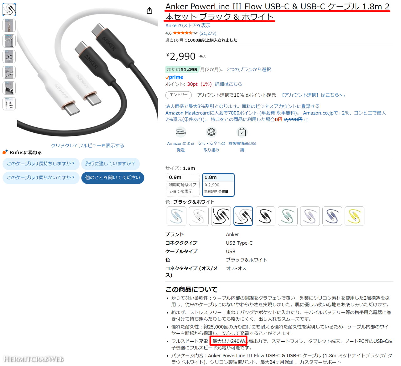 Amazon製品ページが分かりづらいということで評判の #Anker #PowerLine III Flow 240W USBケーブルだけど、今見たら全カラーが240W対応になってる!!????