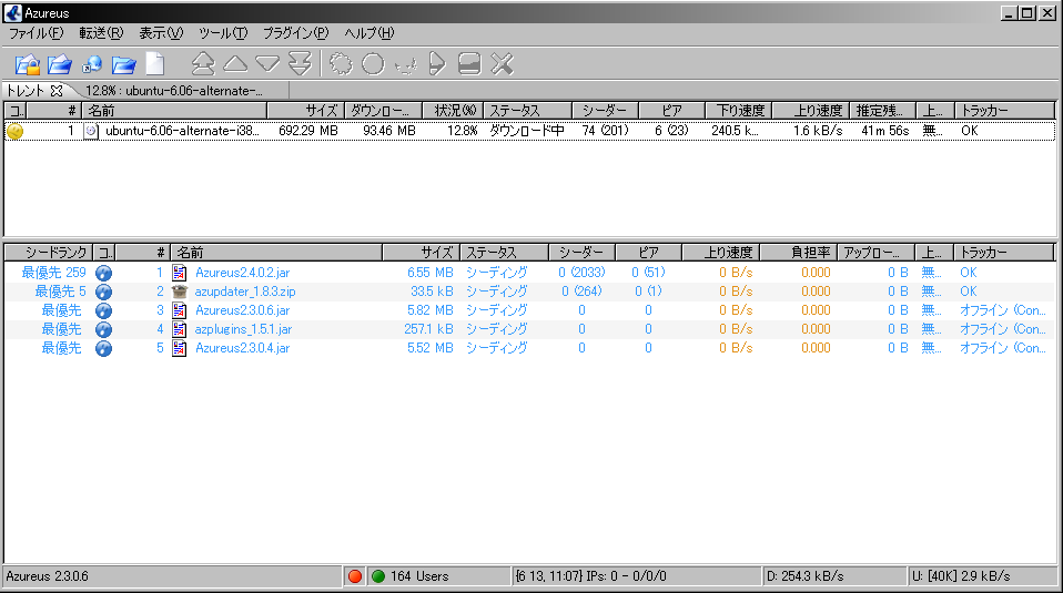 閑話休題。BitTorrentは大容量のファイルを高速にダウンロードするのに便利です。最近は、Openoffice.orgのインストーラ(約100MB)やUbuntu6.06のISOイメージ(約700MB)をダウンロードするのに使いました。あと、私の使ってるAzureusというクライアントには、視覚的にも面白い効果があって見てて面白いのです。