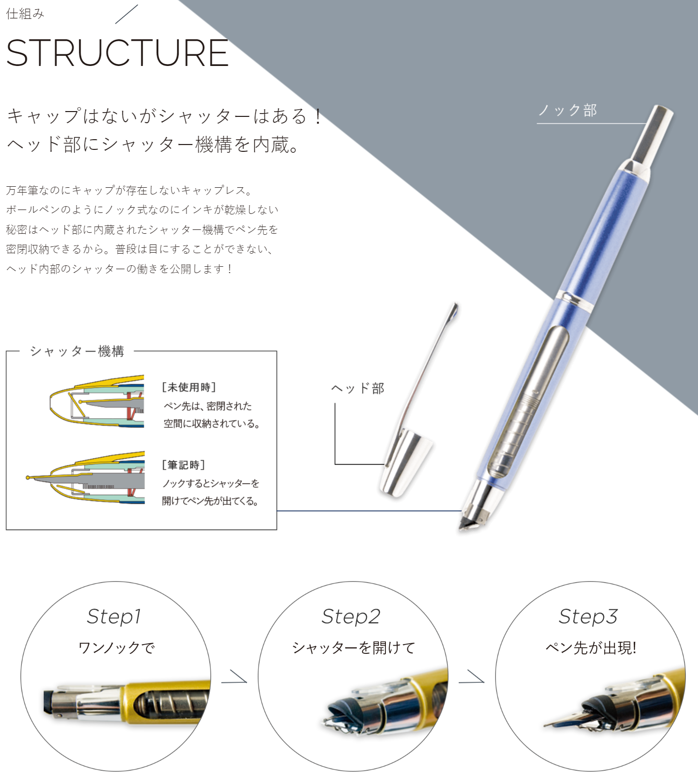 ただキャップレスの宿命で、カートリッジやペン芯は洗浄できるものの、キャップレス機構の洗浄はご法度です。複雑に稼働する箇所ですし、ペン先の乾燥を防ぐためのノウハウが詰まった部分なので、下手に水洗いしてしまうと水分が抜けずサビや動きが悪くなるなどの不具合が出るそう。