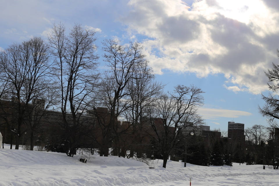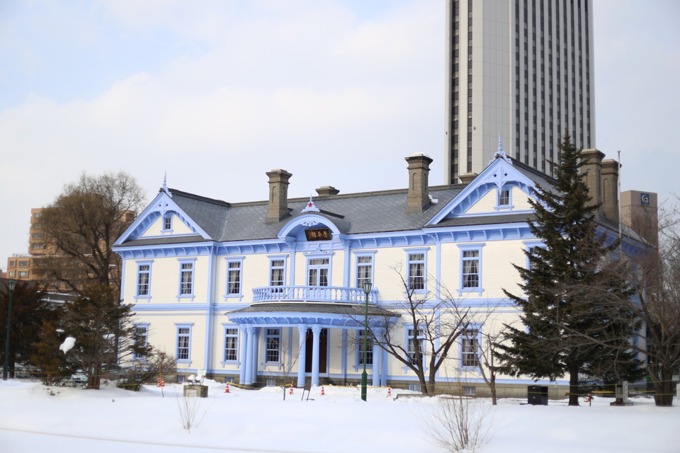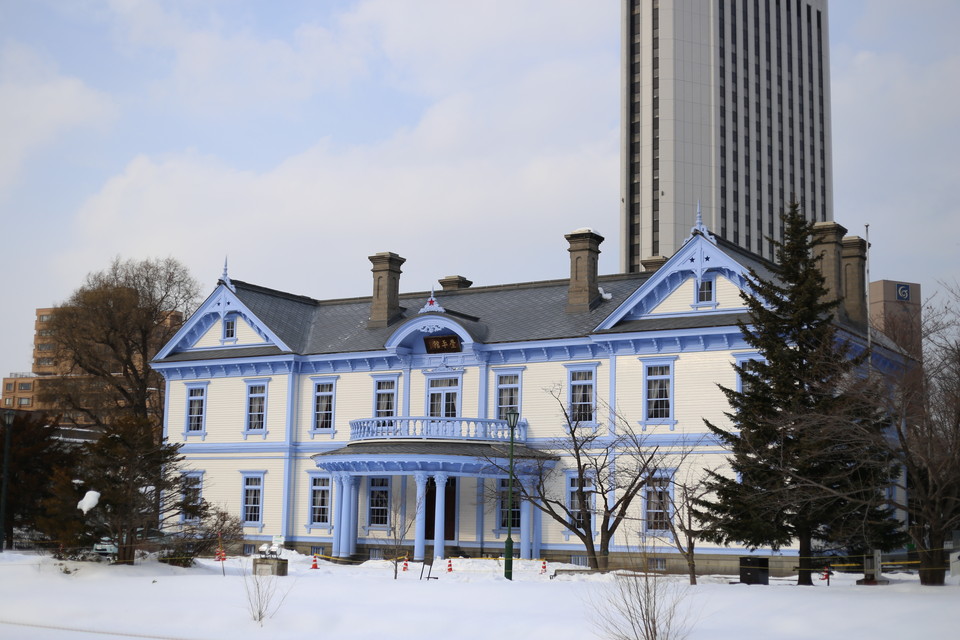 まずこちら。札幌市中央区中島公園にある豊平館です。絞りは開放のf=1.8、ISO100、そこそこの好天で被写体が白いためシャッタースピードは1/4000秒でも露出オーバー気味です。この設定でレンズ光学補正をオフにしています。四隅がやや暗くなっているのがわかるでしょう。