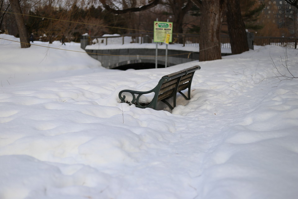 雪に埋もれたベンチ。
