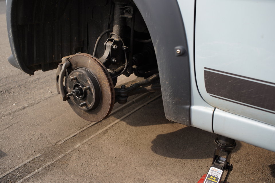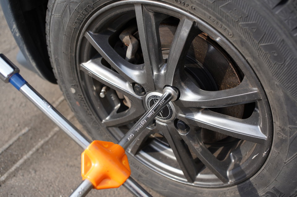 ジャッキアップする前に、ナットを緩めます。ナットが外れるほど緩めてはダメ!ちょっと緩む程度でOK。ジャッキアップ時は車体が不安定になるので、力のかかる作業はジャッキアップする前に行うのです。