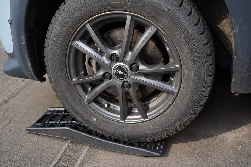小生は冬にスタックした時に使うヘルパーを使っていますが、厚めの板切れや電話帳など、なんでもいいと思います。