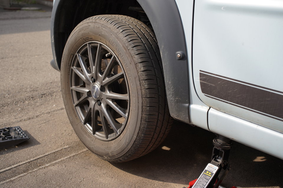 交換するタイヤを取り付け、ナットをある程度のところまで締め込みます。完全に締め込む必要はありません、というか、繰り返しますがジャッキアップ中は車体が非常に不安定なので力のかかる作業は厳禁!とにかくすみやかに作業し、ジャッキを下ろします。