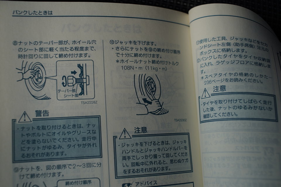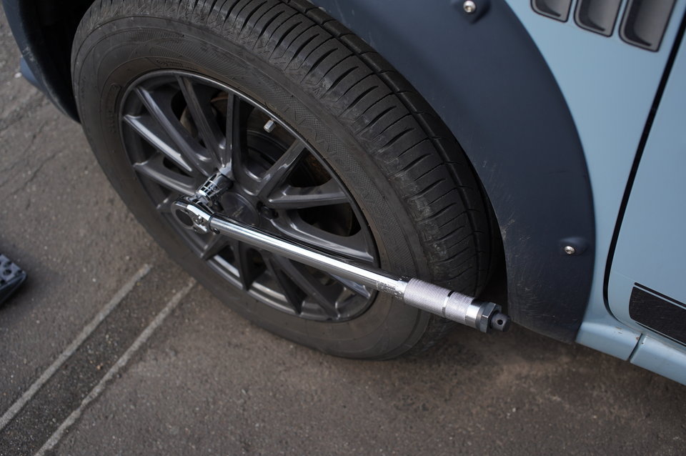 ジャッキを下ろしたら、ナットを規定のトルク値で締め込みますが、トルク値は取説に書いてあります。小生のキューブは、108Nm(ニュートンメーター)です。