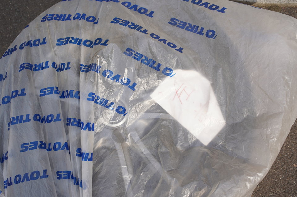 本当は、交換するタイヤを車体の近くに入れておくと、不用意にジャッキが外れた時にボディ下が地面と激突するのを防げてモアベターです。