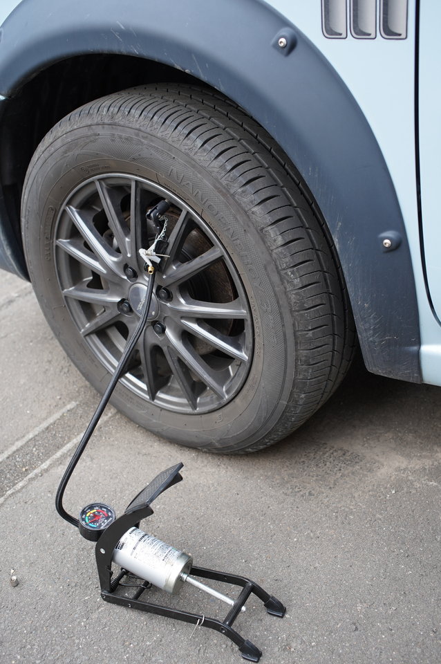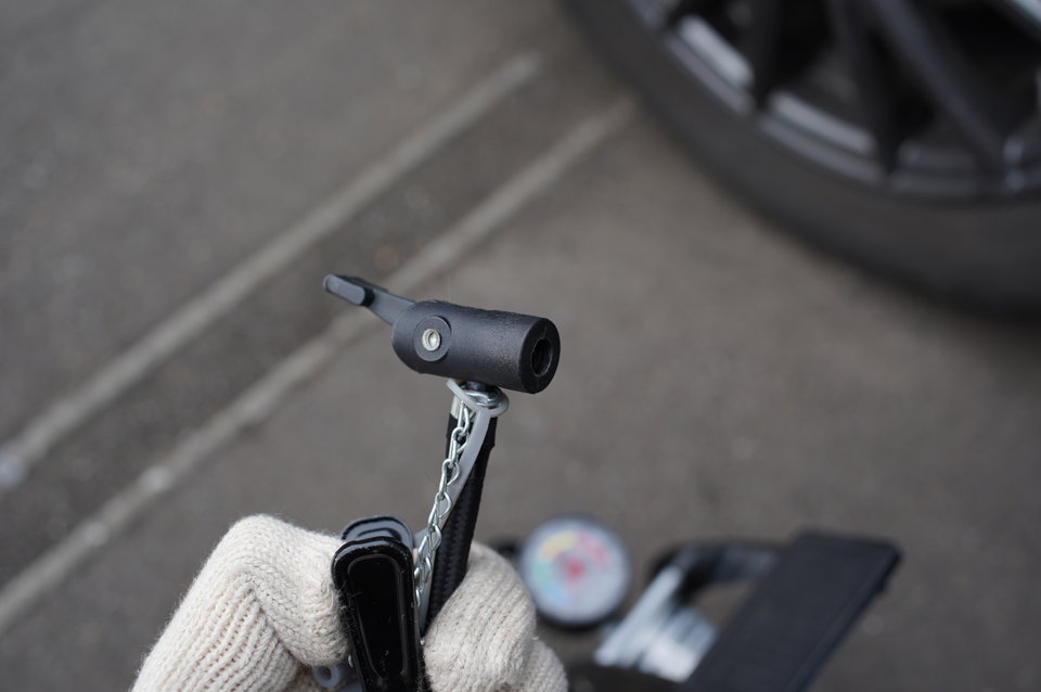 タイヤの空気はガソリンスタンドやカー用品店で入れることができますが、このような口を備えた空気入れで入れることもできます。
