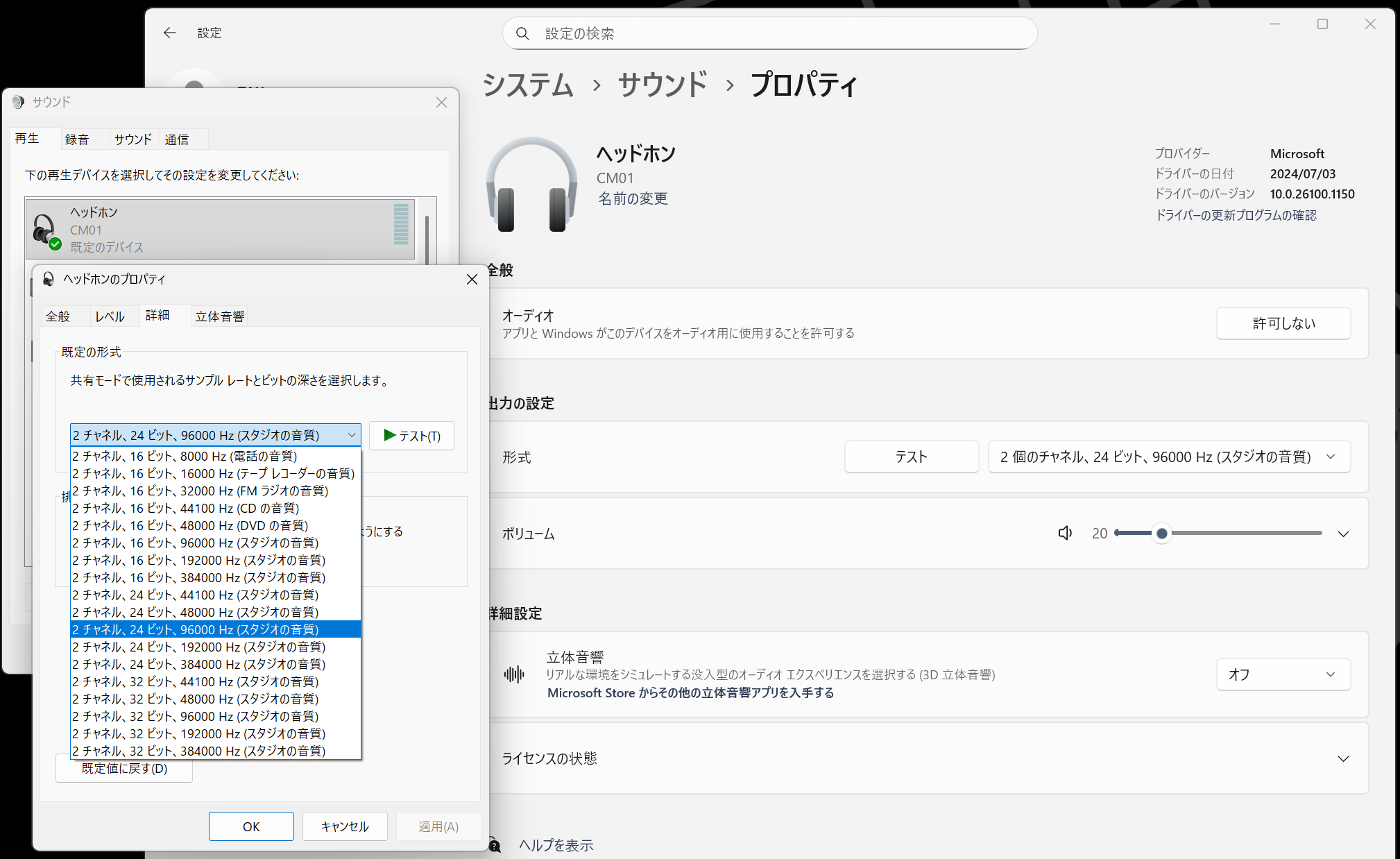 プロパティを開いてみると、名前はCM01となっていてこの製品と同じ名称です。出力レートはデフォルトでは16bit48kHzになっていましたが、このように32bit384kHzまで選択できます。スペック通りではありますがそんなに高音質な音源は手元にありませんので、とりあえず充分に高レートな24bit96kHzを選択しておきました。