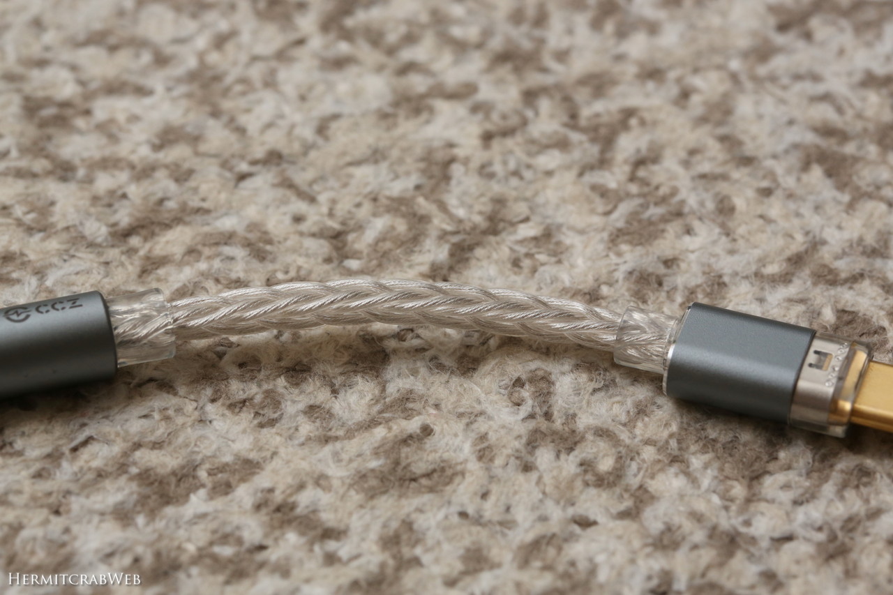 出力は汎用性の高い3.5mmステレオで、通常の3極(TRS)に加えマイク付きケーブルなどの4極(TRRS)にも対応。USBコネクタとDAC部分とをつなぐケーブルは8芯単結晶銅&銀メッキです。