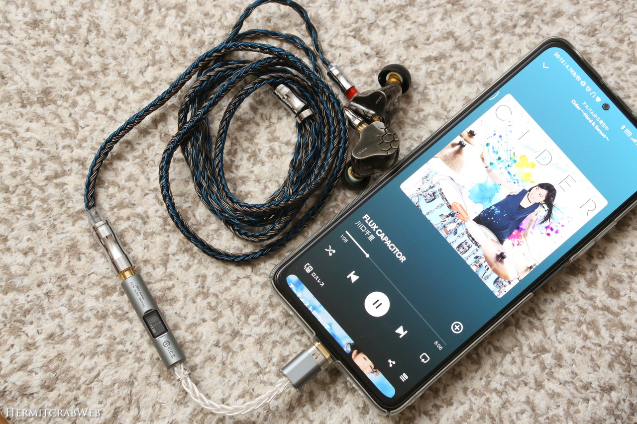 スマホで聴くときはこんな感じの接続になります。イヤホンはKBEAR LARK(1DD1BA)、ケーブルはNICEHCKの24芯ケーブルをチョイス。