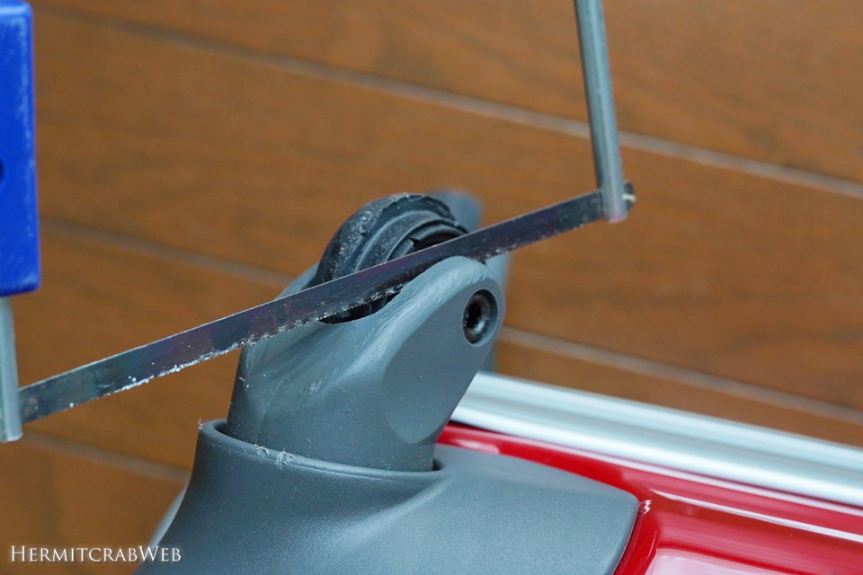 こんな感じで、タイヤの隙間に金ノコを通し、シャフトを切断していきます。電動工具を使う場合はこの部分に刃を入れるのが難しいこともあるので、タイヤごと二つにスライスする要領で刃を入れてしまっても良いでしょう。