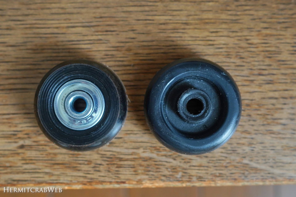 新しいタイヤ(左)は金属のハブ部分とゴムっぽい弾力のあるタイヤ部分で構成されています。よく見るとベアリングが入っているようで、潤滑と長期間の運用が可能になる構造になっています。