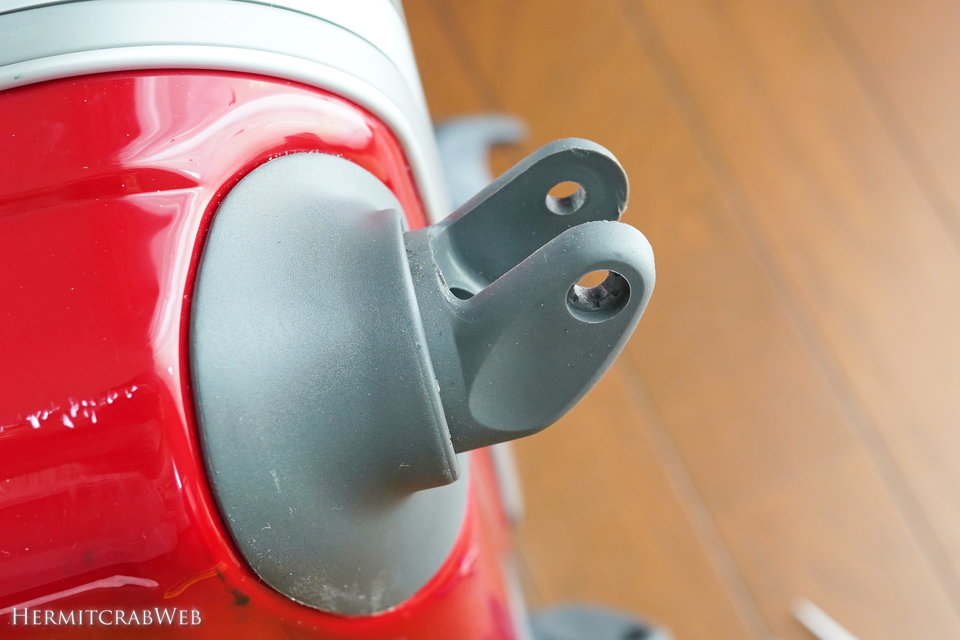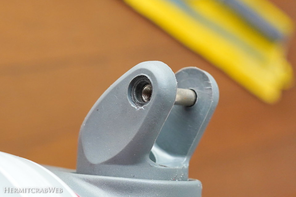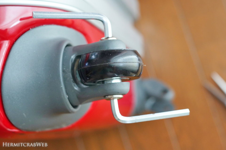 このスーツケースの場合、フォーク内にワッシャーを入れる隙間は全くありませんでした。というわけで、ワッシャーは入れないことにし、左右からネジを締め込んで固定完了。どれくらいのトルクで締め付ければよいかわかりませんでしたので、ひとまずこの短い六角レンチでギュッと締め付ける程度にしてみました。緩み止めも入ってますし、当面は緩んでくることはないでしょう。