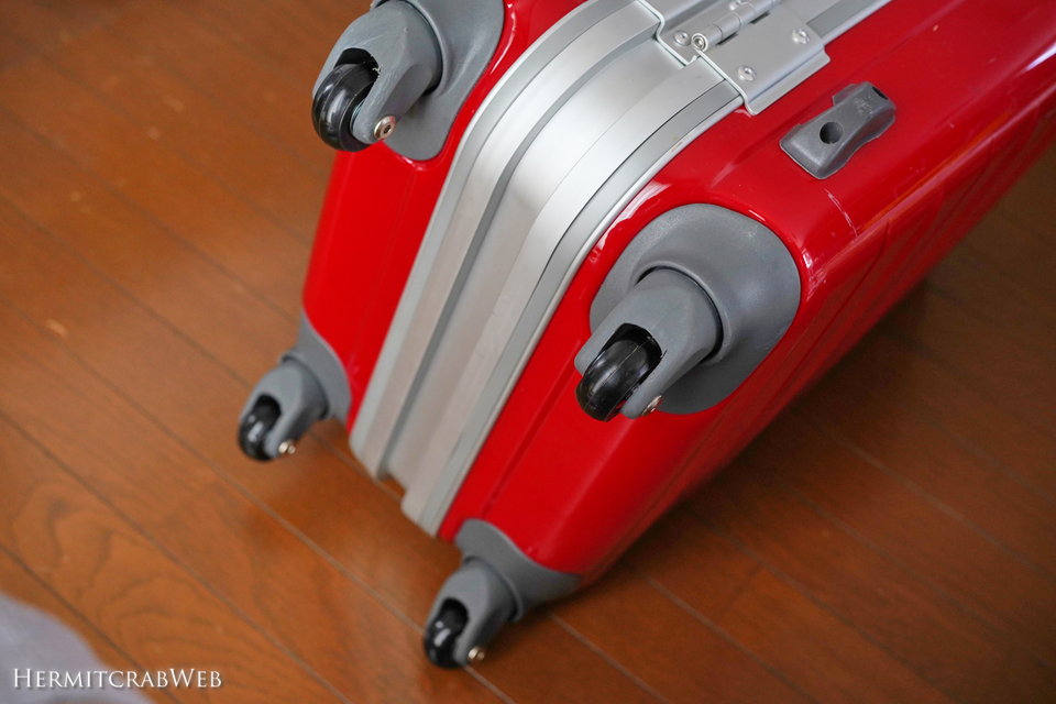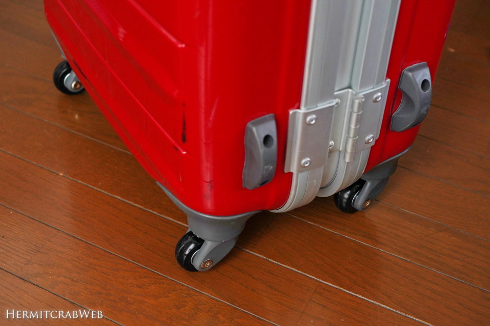 ちなみにタイヤが壊れていたのはスーツケースの裏側の2つでした。4輪スーツケースとはいえ4輪が均等に働いているわけではなく、2輪で転がすこともあり使用機会の多い裏側(ハンドル側)のタイヤが痛みやすいのかもしれません。