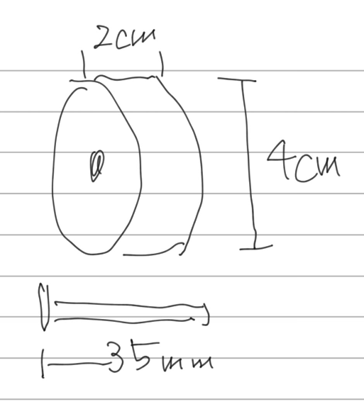 タイヤ直径は約4cm、幅は約2cm、必要なシャフト長は約3.5cmくらいでした。このほかフォークの内寸(タイヤが収まる部分の最大幅)も念のため調べておいたほうが良いです(小生は省略してしまいました)。