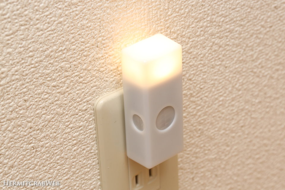 周囲が暗くなるとこのようにナイトライトモード:電球色で点灯します。無印のと違い人感センサーはありませんので、夜の間ずっと点いていることになります。