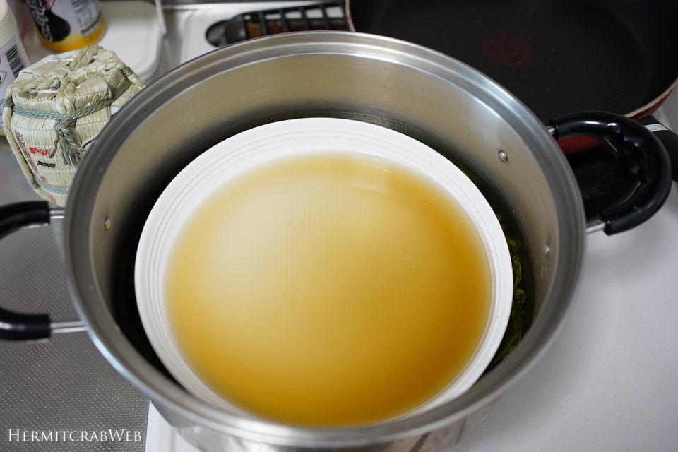 落し蓋がないのでお皿で代用します。このまま一晩置いておきます。