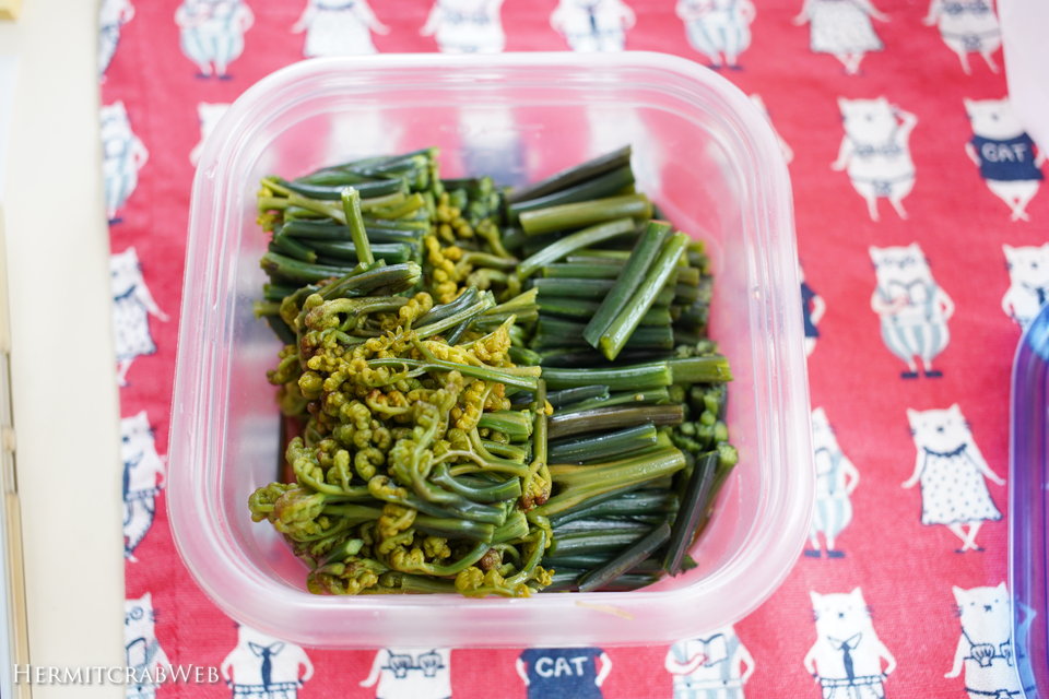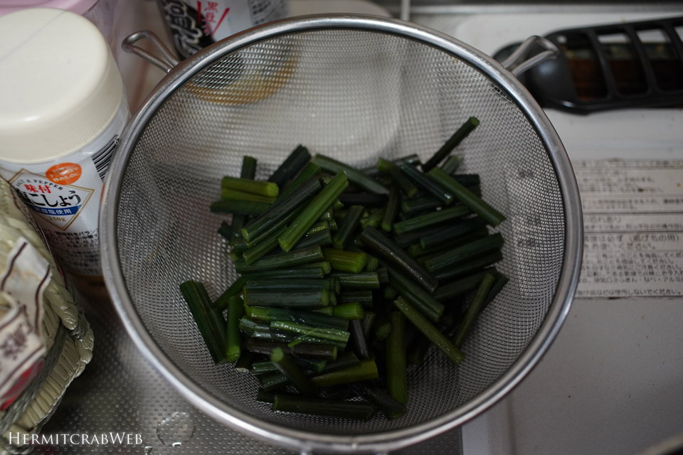 試しに食べてみると・・・うむ、苦味はほとんど無く、食べられる!茎の部分もシャキシャキだけど噛み切れる!切り口からにじみ出る山菜特有のぬるぬる感!これは成功かも!