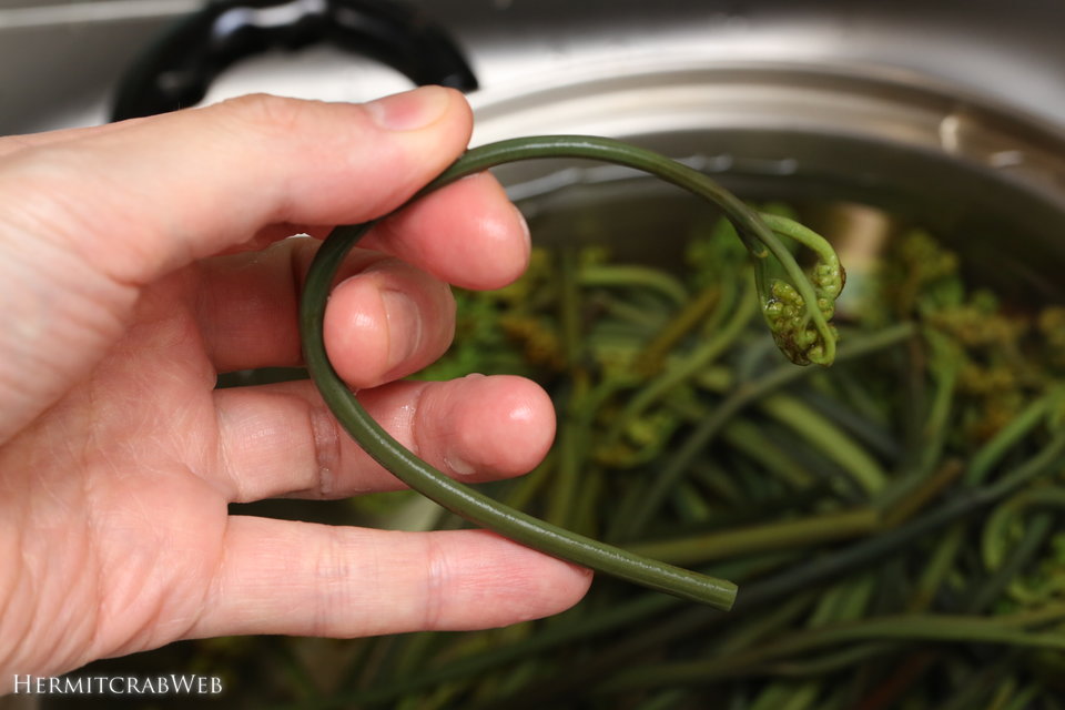 朝になりました。わらびを水洗いして1本取り出してみると・・・前より明らかに柔らかいぞ!