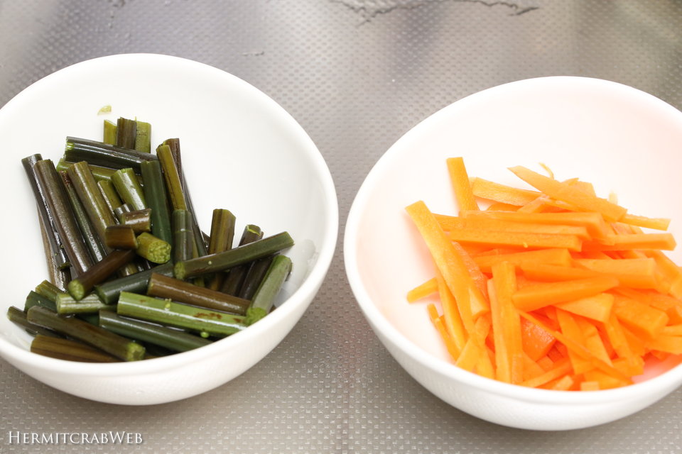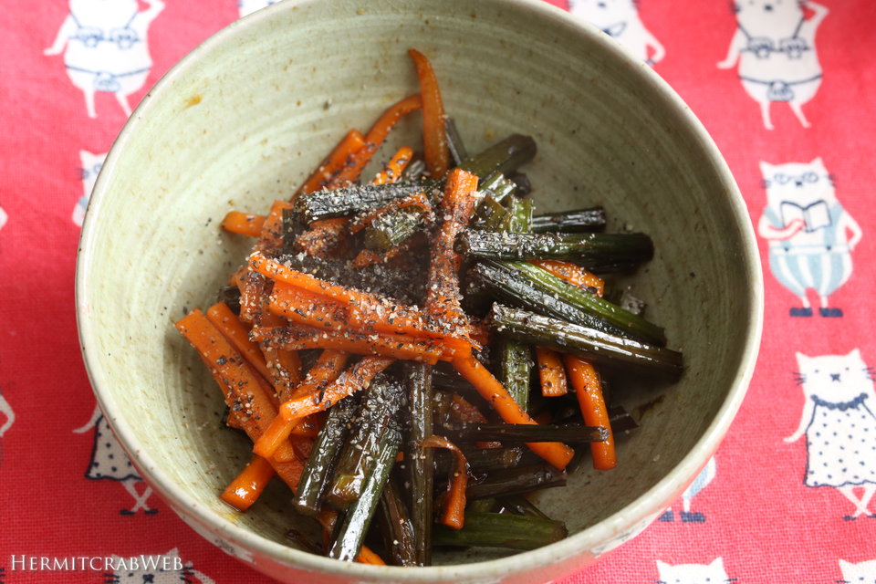 下ごしらえは成功しかなりの部分がそのまま食べられる状態になりましたが、やはり固い部分はありましたので、固いところは小さく刻んで今回もきんぴらに。細く刻んだ人参と一緒にごま油で炒め、砂糖と醤油で味付けし、すりごまを振ったら・・・