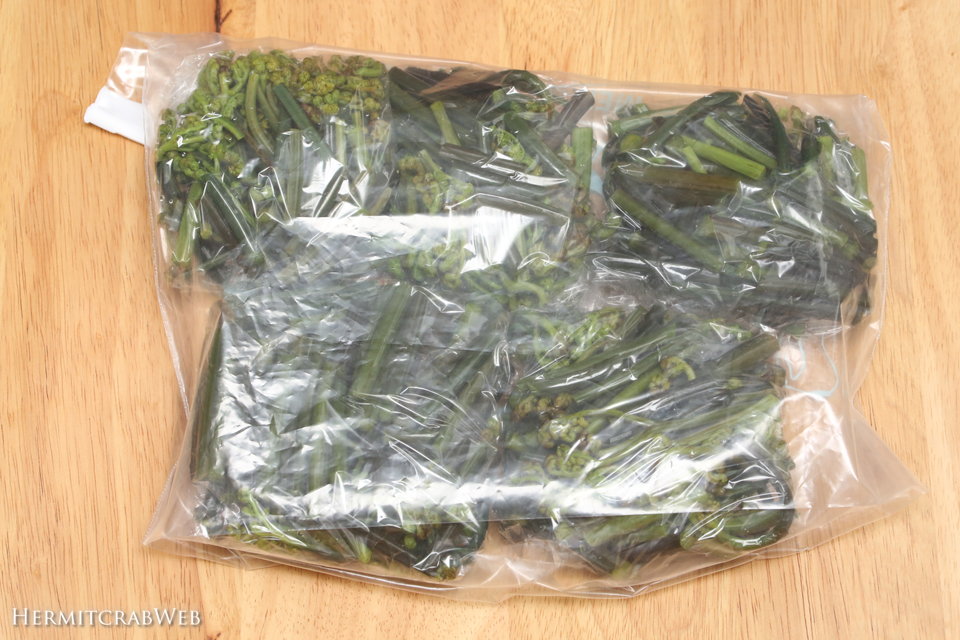 下ごしらえしたわらびは、水につけたまま冷蔵庫に入れ、1日1回水替えすれば1週間くらい持つそうですが、前のおひたしがまだ残っていますし、1回分ずつ小分けにし冷凍保存することにしました。
