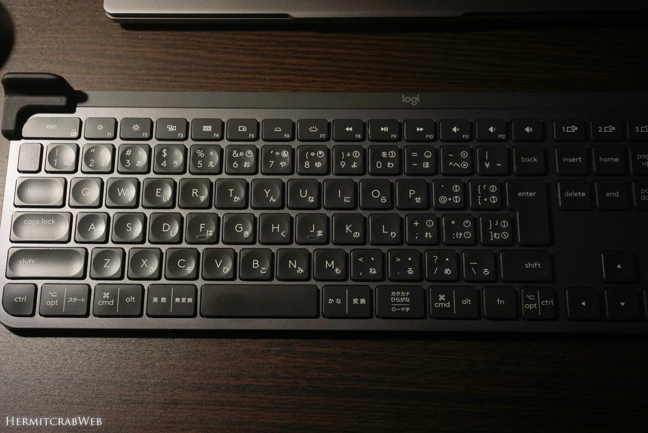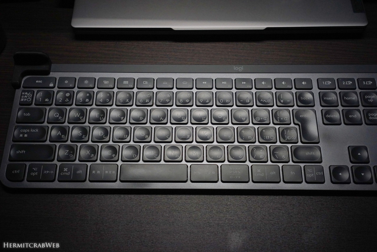 これではタイピングの妨げになってしまいます。ブラインドタッチは若干できますけど、やっぱりキーの位置は目視で確認したいじゃないですか。でもキートップが見えづらいので、場合によっては頭の位置をずらしてキートップを見たりして、これがとてもストレスなのです。