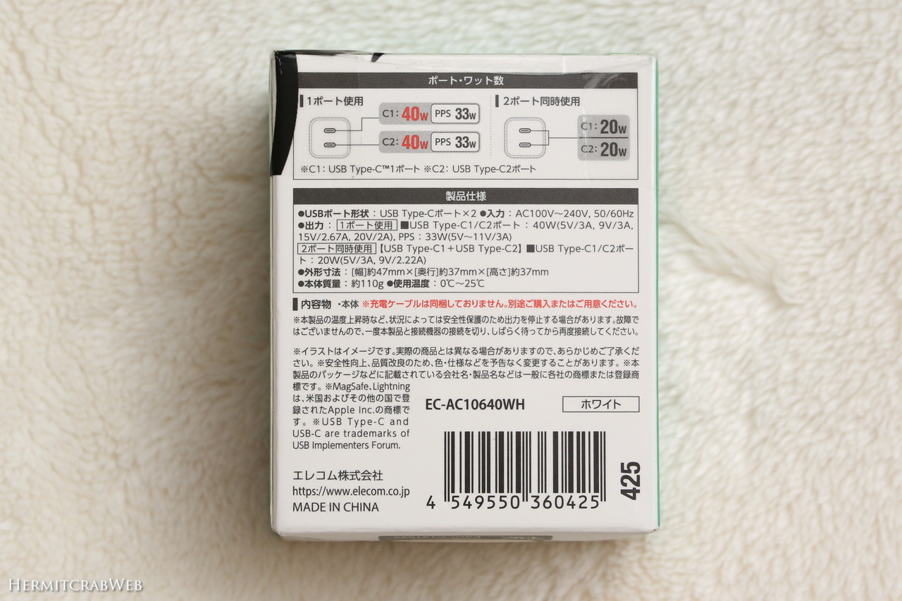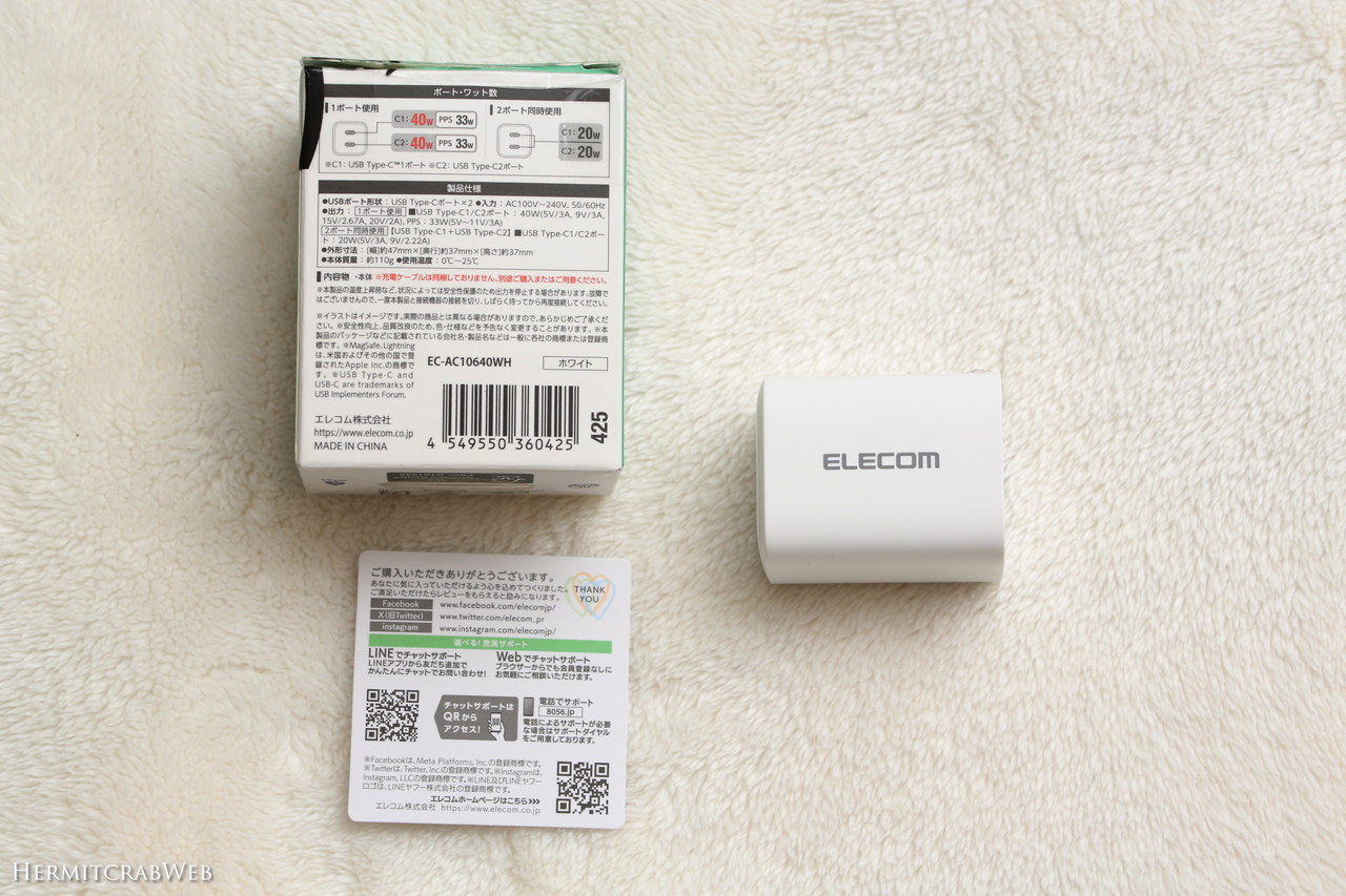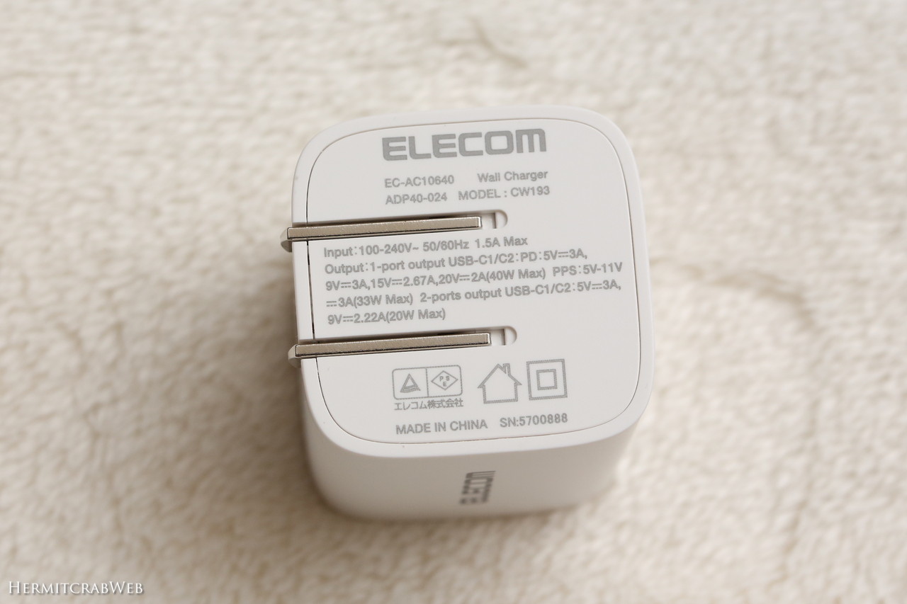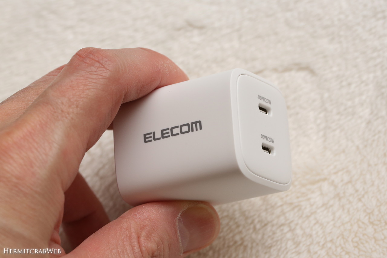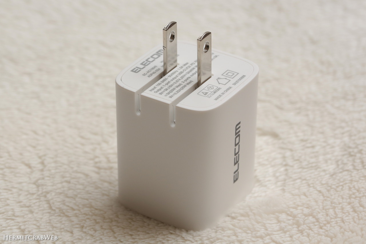 EC-AC10640WHは最大40W出力なので、手持ちのノートパソコンへの給電には力不足です(Macbookには充電できるそうですが)。この充電器は、高齢親の実家に持っていこうと考えています。