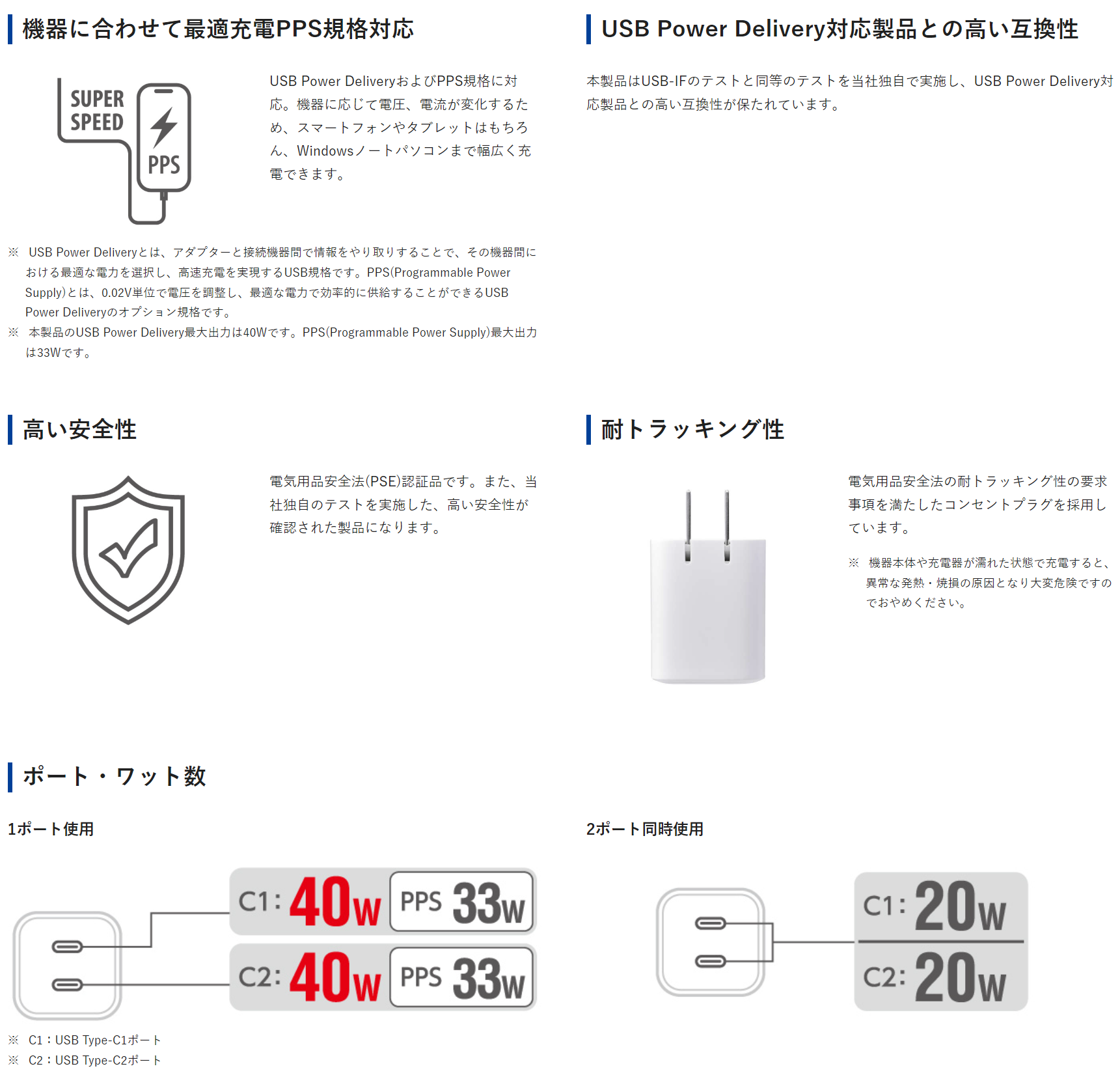 定格出力電流 [単独接続時]USB Type-C1ポート/USB Type-C2ポート:5V/9V時3A、15V時2.67A、20V時2A、PPS出力5~11V時3A