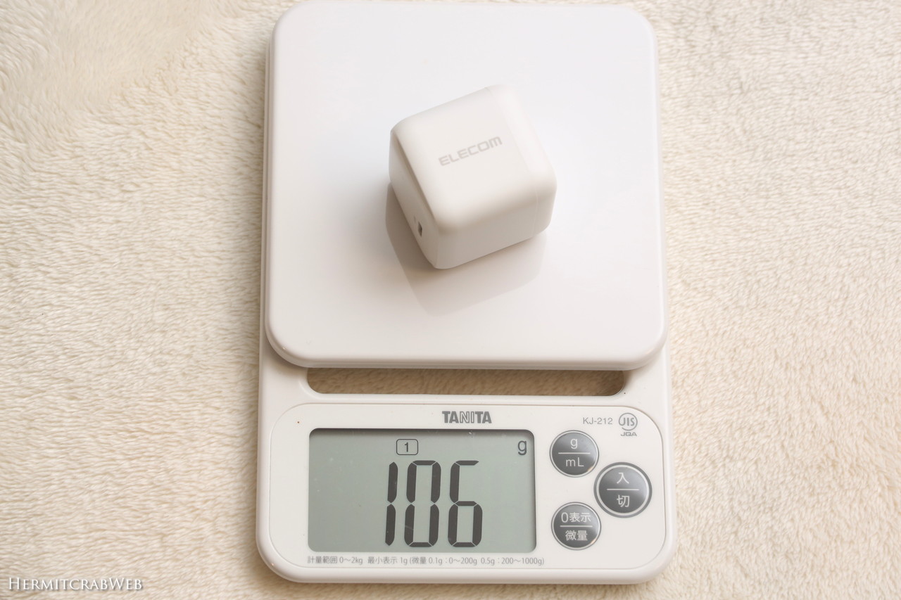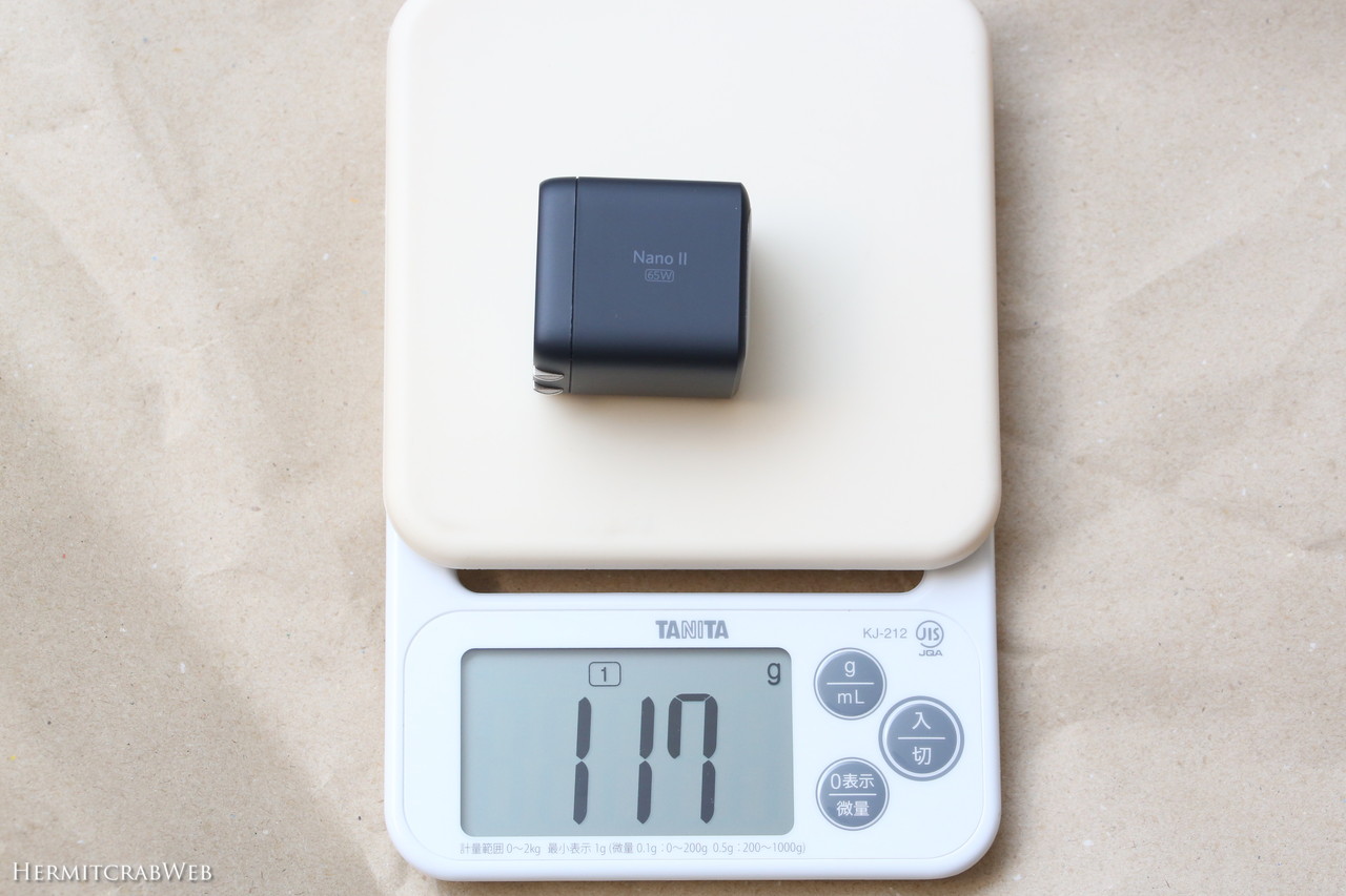 ちなみにAnker Nano II 65Wの重量は実測で117gでした。これよりは若干軽いものの、同様の性能であることを考えると106gというのは極めて妥当な数字だと思います。