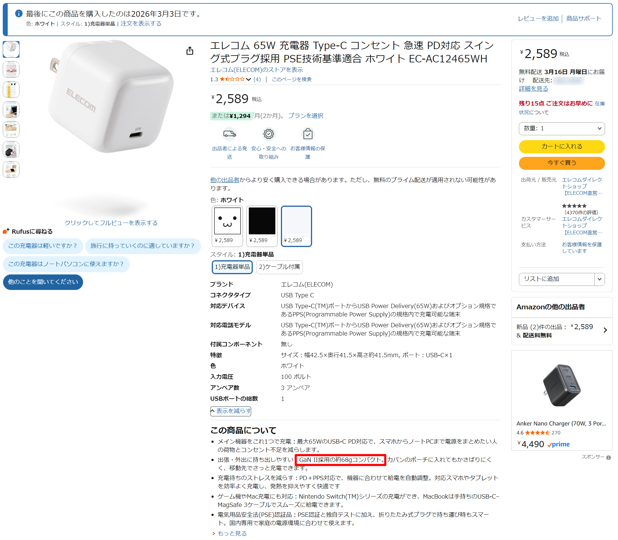 65W充電器はノートパソコンを運用している方以外にはオーバースペックではありますが、高出力のモバイルバッテリーに高速で充電できるなど、意外と使い所はあります。Ankerなどより後発でアンカーより安価なエレコム製充電器をお一ついかがでしょうか。