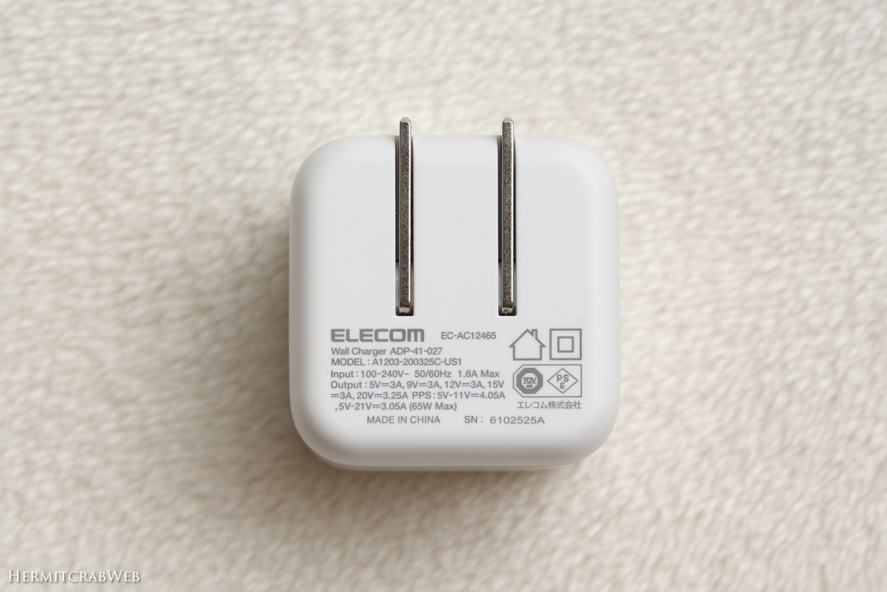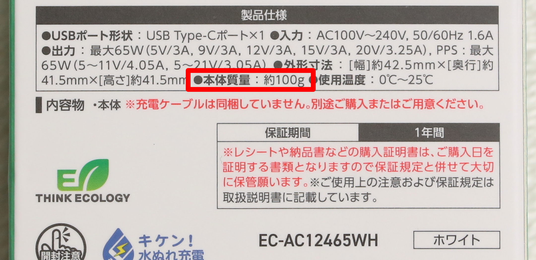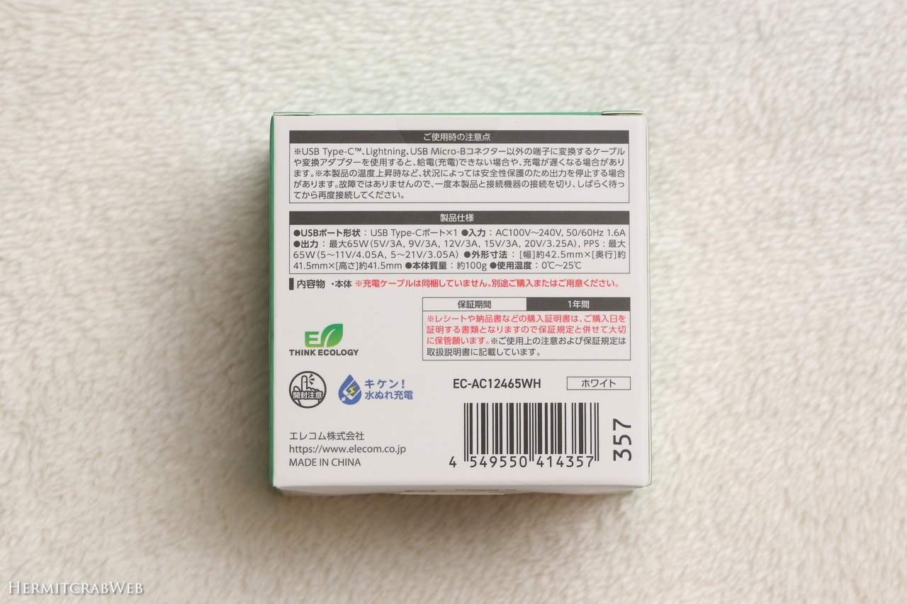 EC-AC12465WHという見慣れない型番。今年2月26日発売の新製品らしいけど、65W単ポートながら価格は1,990円と破格!というか有名メーカーの65W充電器で2,000円切ってるの見たことないのでポチった!
