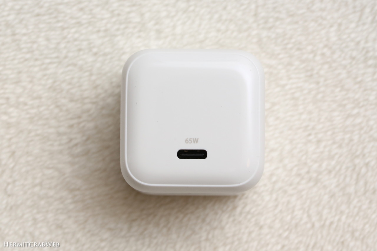 EC-AC12465WHの正面はこんな顔です。ほぼ正方形の艶ありフェイスの下方にUSB Type-Cポートが1つ。その上には65Wと書いてあります。スペックがちゃんと書いてあるのは、わかりやすくて好いですよ!!