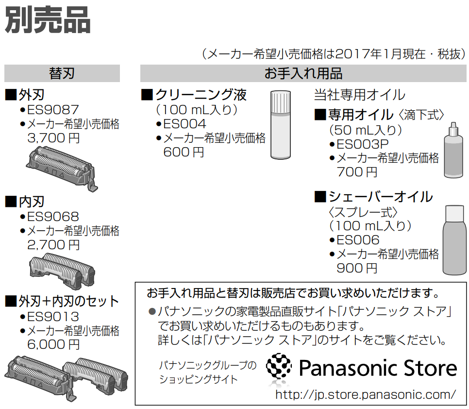 取説にも、刃の交換方法と替刃の品番が載っていました。外刃と内刃のセットはES9013という品番とのことです。