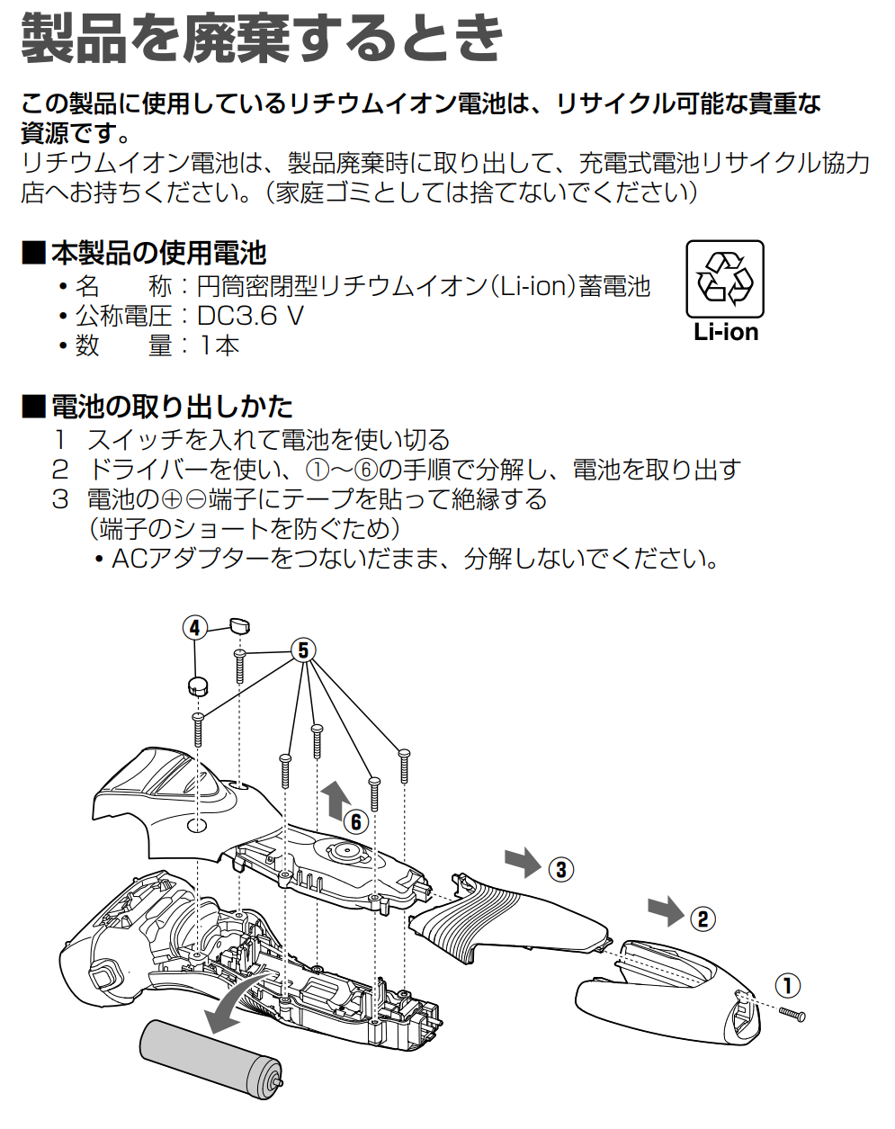 ちなみにラムダッシュES-ST2Pの取説には、本体の分解方法も図入りで記載されていました。リチウムイオン電池のリサイクルのための情報ですが、このリチウムイオン電池は交換品が流通しています。
