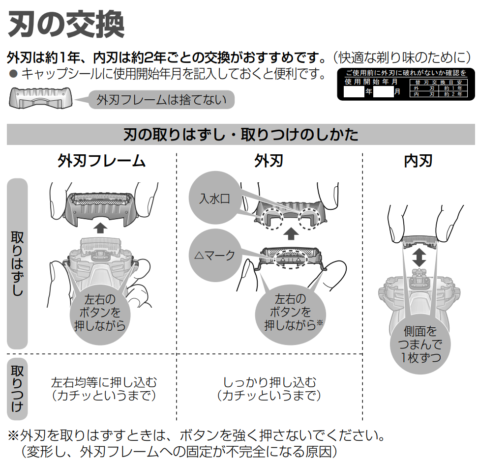 そしてなんと、刃の交換時期は、外刃は約1年、内刃は約2年とのこと。交換時期をとうに過ぎているのに刃の交換もせず、新しいシェーバーを欲しがるとは、へそで茶を沸かしますね!