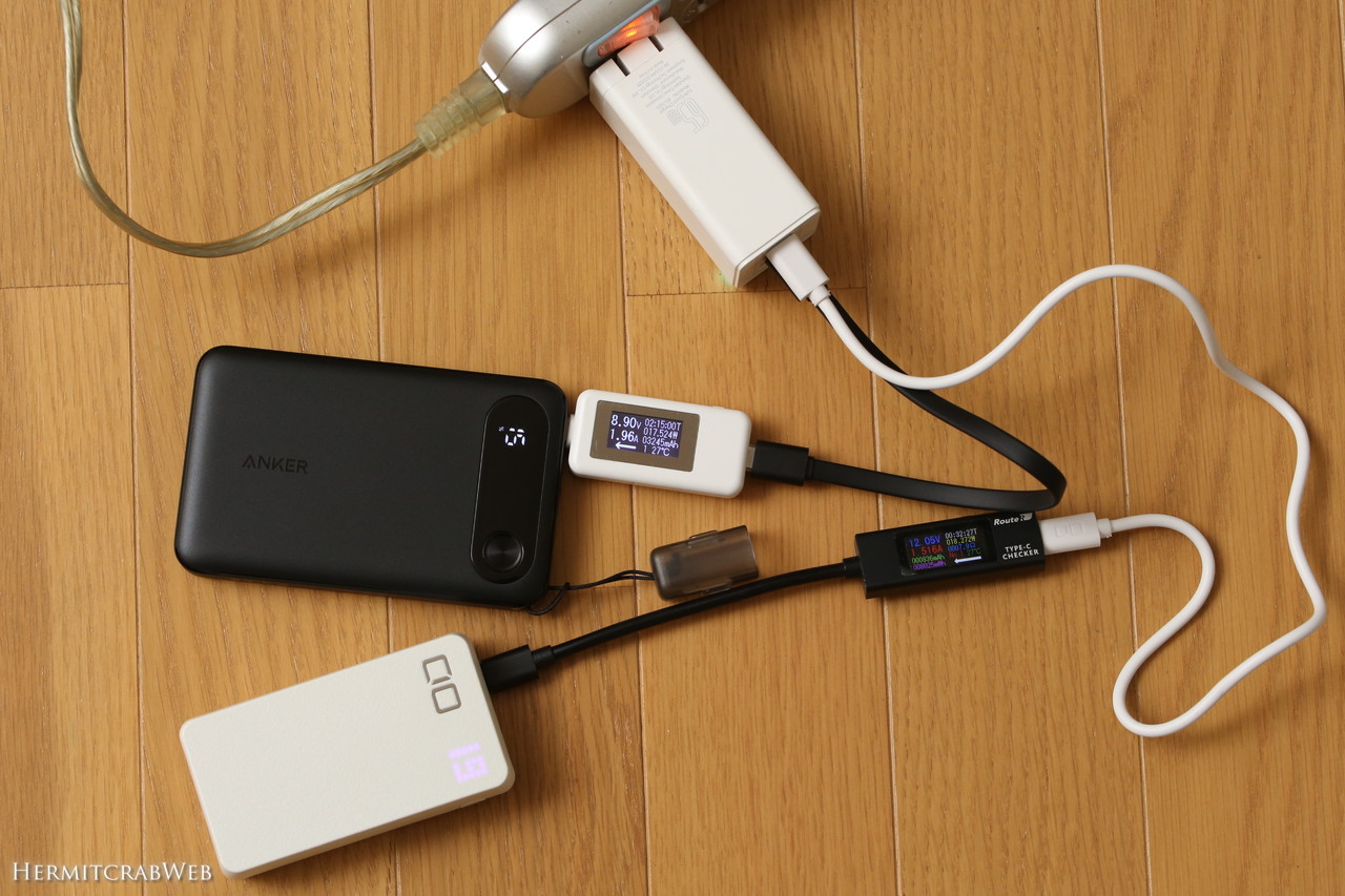 充電器は控え選手に回っていたBaseusの65Wタイプをチョイス。USB Type-Cポートを2基とUSB-Aポートを1基備えているので、モバイルバッテリー2台を同時に充電できます。念のため動作チェックしておきました。