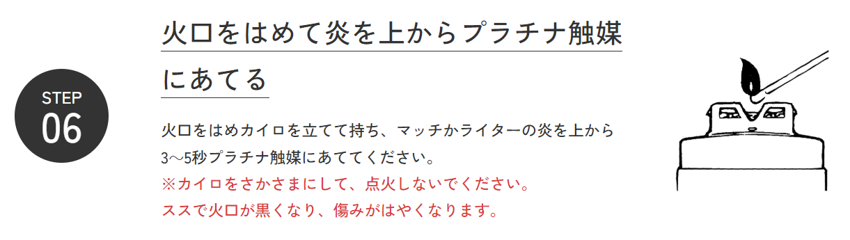 反省の意味も込めて、ハクキンカイロの使い方を改めて確認。マッチやライターの炎は上からあてるのが正しい点火の方法です。