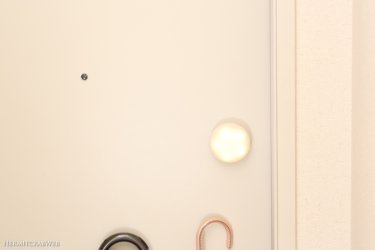 玄関ドアにくっつけてみました。自宅の玄関は基本的に暗く、靴を履いたりするときには明かりをつけなければならないのですが、明かりをつけると廊下全体が明るくなるので夜間などは憚られることもありました。