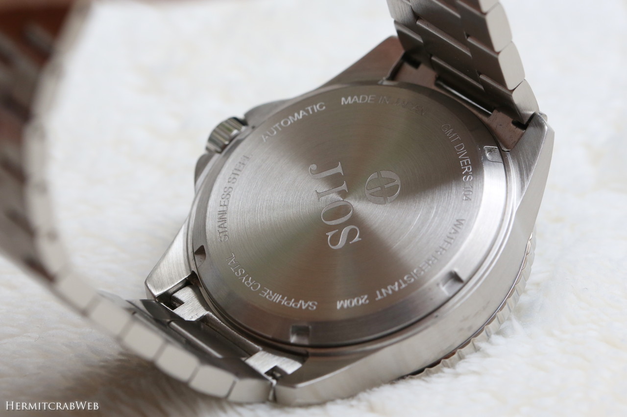 翻ってJIOS GMTダイバーズ104ですけど、どこにも明快に書いてありませんが防水検査のやり方などを見るとおそらく普通の20気圧防水で、200m空気潜水防水ではありませんね。
