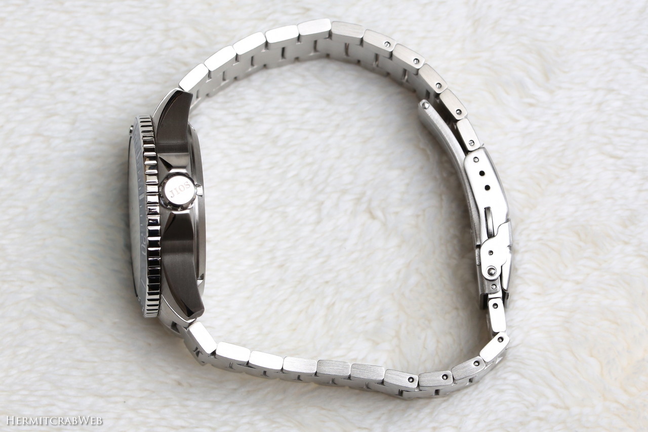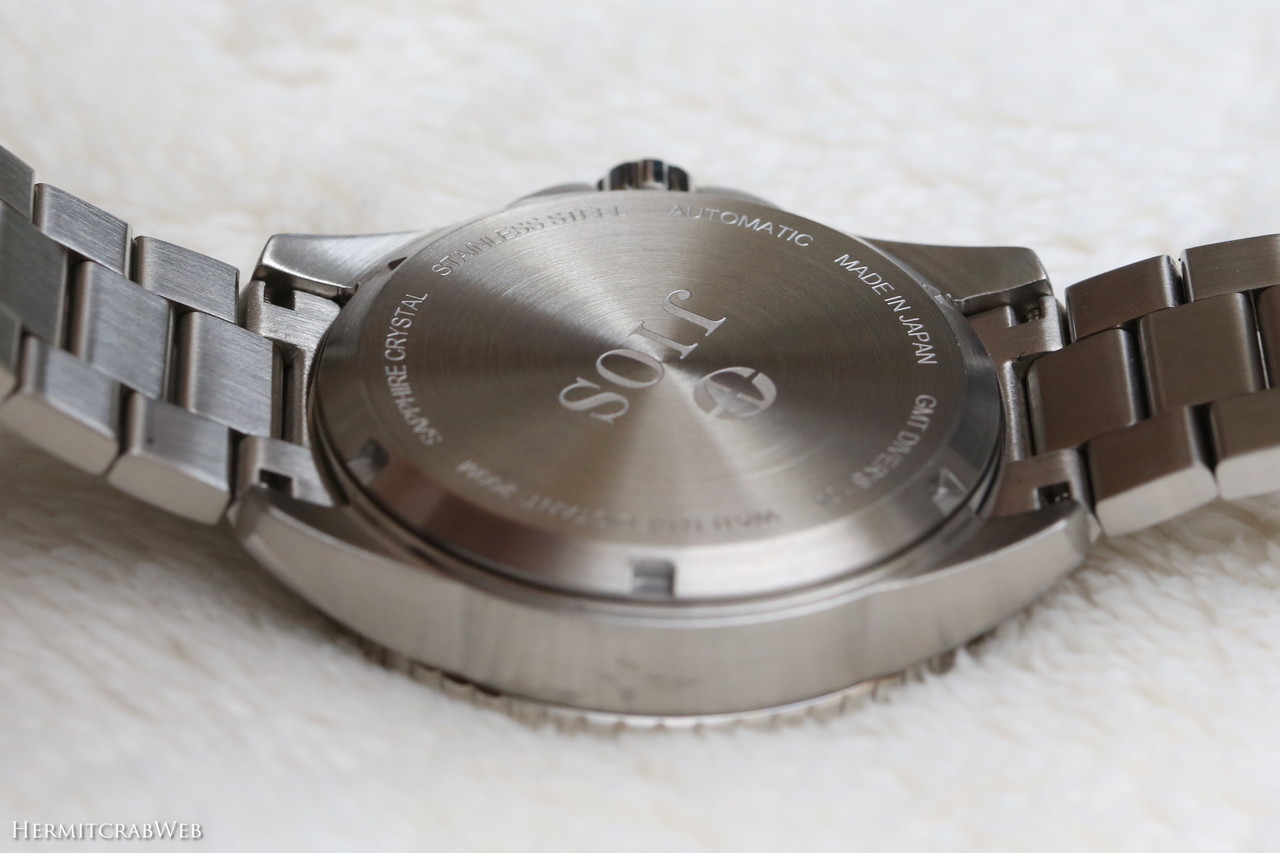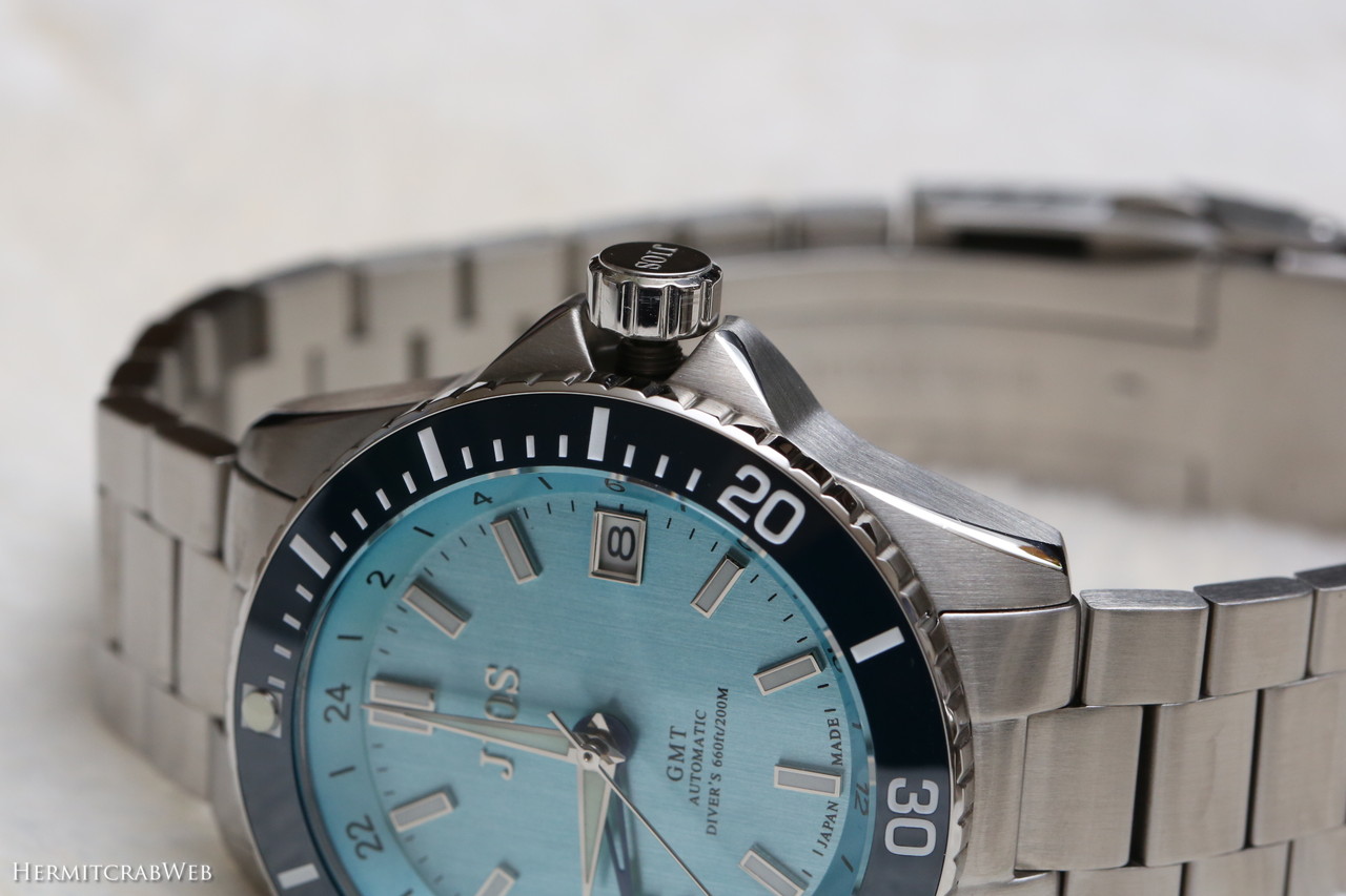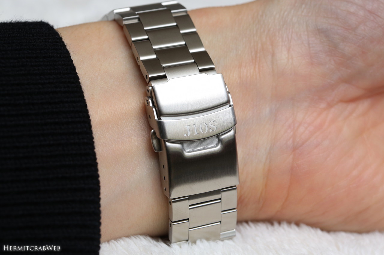 竜頭にはJIOSの刻印があり、ダイバーズらしくやや大きめの竜頭ガードに守られています。